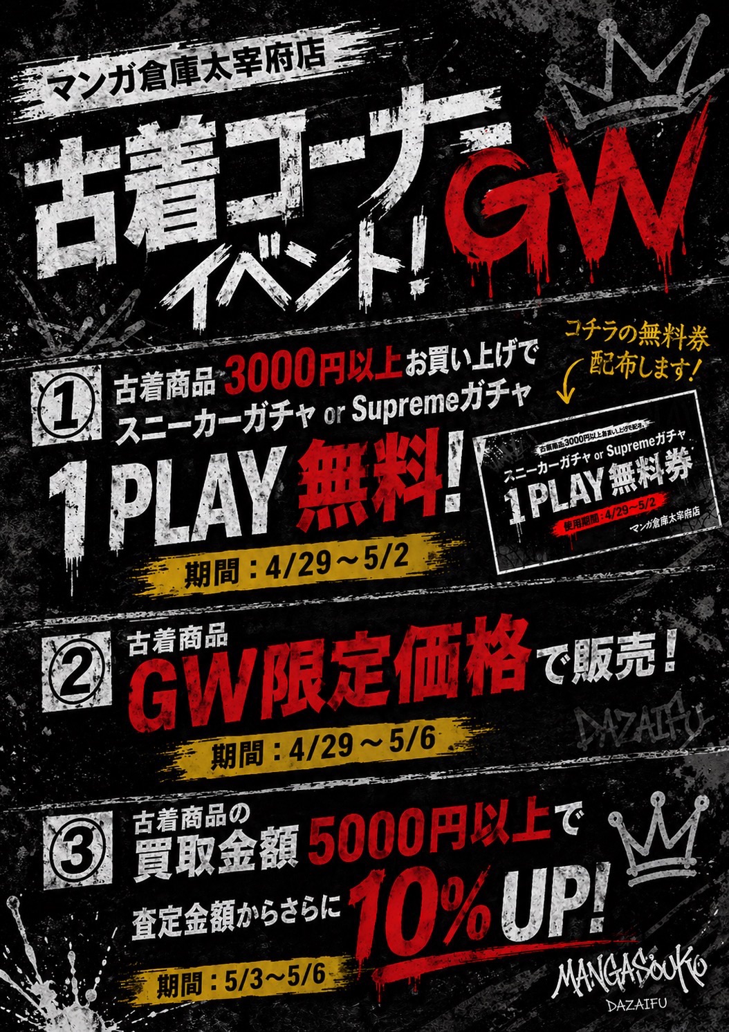 古着コーナー GWイベント告知!! #マンガ倉庫太宰府店 #gw #ゴールデンウィーク #ガチャ #限定価格 #買取プラスアップ #お買い得 #イベント #イベント開催 #fashion #ファッション #古着屋 #古着 #買取 #太宰府 NEW イベント情報! ファッション 2026年4月27日 古着コーナー GWイベント告知!! 今回の連休も 豪華イベント開催します!! ガチャ無料や限定価格販売、買取プラスアップなど、超お得なイベント3つもあります!! レアな商品や高額で買うのを迷ってたあの商品がGW限定価格で販売するかも…!? ゴールデンウィークはマンガ倉庫太宰府店にLet’s Go〜!!🔥 ★店舗《Instagram / Twitter》フォローお願いします★ ★買取告知・イベント情報はこちら★ ★各部門の買取・入荷情報はこちら★ 共有: X で共有 (新しいウィンドウで開きます) X Facebook で共有 (新しいウィンドウで開きます) Facebook