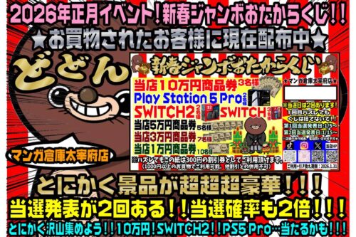 ■正月イベント福袋などもありますが 超豪華景品が当たる新春ジャンボおたからくじも配布中!◆#新春ジャンボ #PS5 #SWITCH2 #SWITCH #商品券 #正月イベント #太宰府 #福岡 #マンガ倉庫太宰府店■