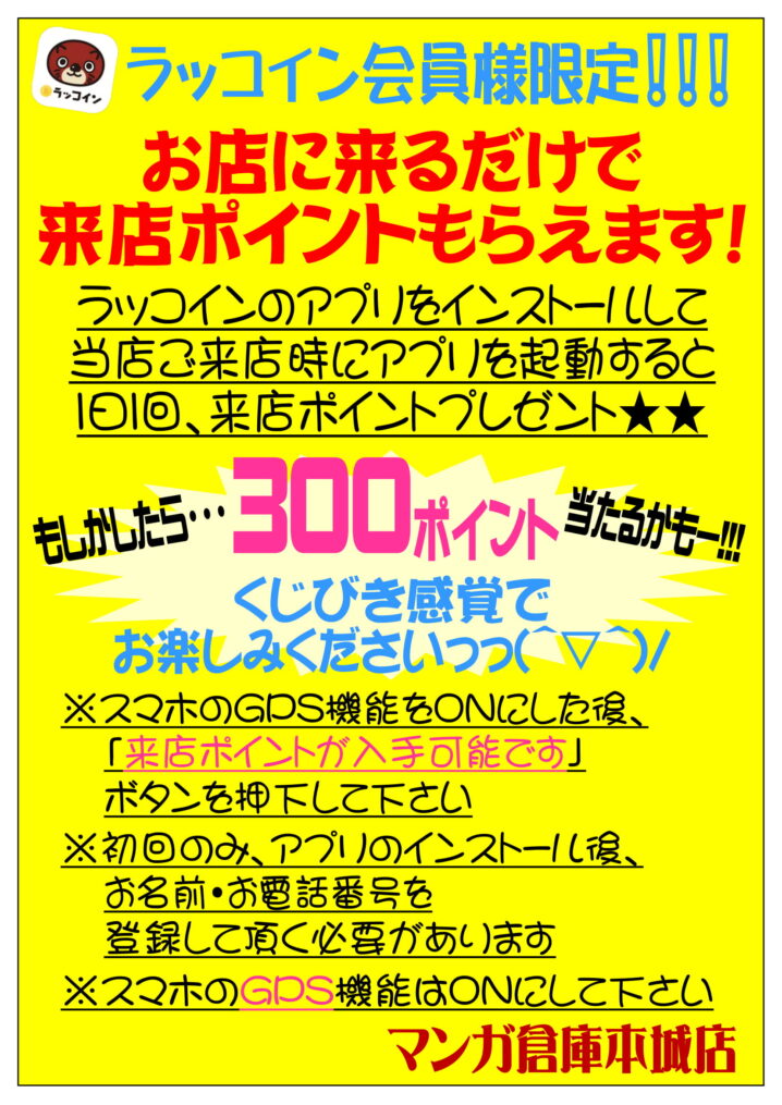 マンガ倉庫のラッコインアプリをご存知ですか!? 本城店ではただいま、売っても買ってもポイント貯まるよ~✨ また、来店ポイント配布も実施中です~☺️🙏 ※GPSをO…
