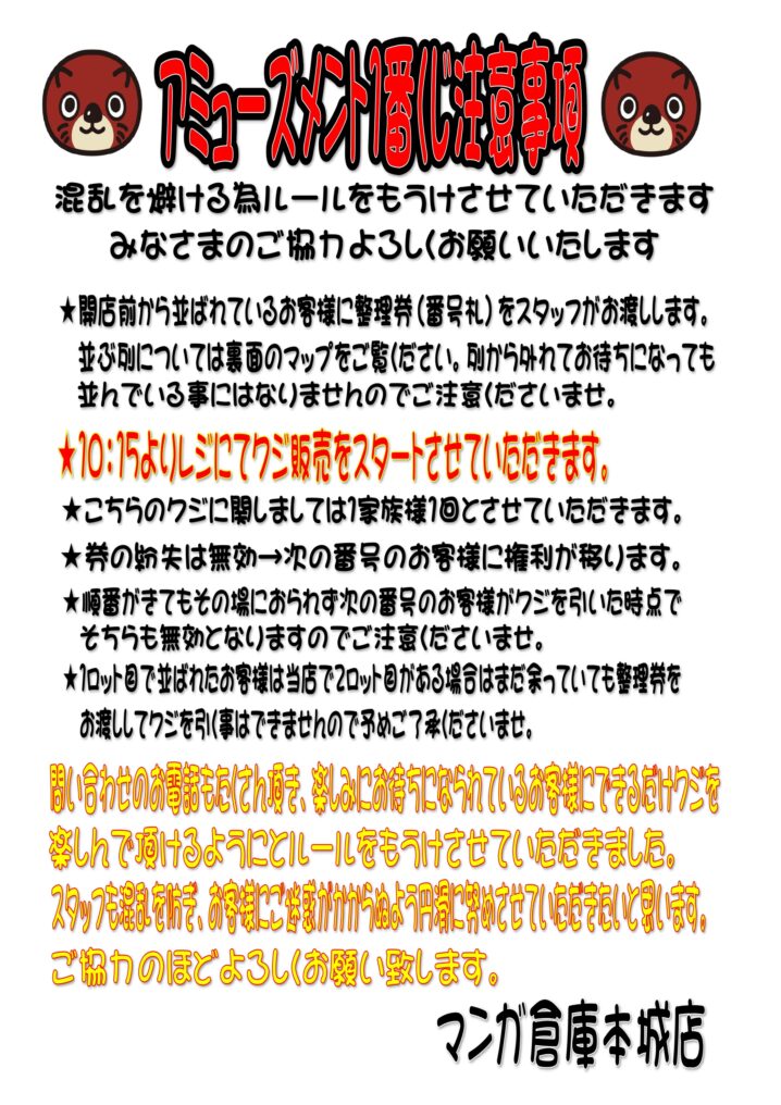 おもちゃコーナーより アミューズメント一番くじBWFC SMSPシリーズのくじ販売について 今後、くじ発売日当日の混雑を 軽減する為、ハウスルールを 設けさせて頂きます。 詳細につきましてはPOPの方を ご確認下さいませ…