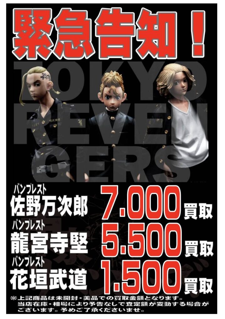 おもちゃより 東京リベンジャーズ フィギュア強化買取してます 在庫が集まるまで買取します! ぜひ当店へお持ちくださいませ ※2021/9/10 現在の買取価格となります。 在庫状況・状態によってお値段が変動いたします。予…