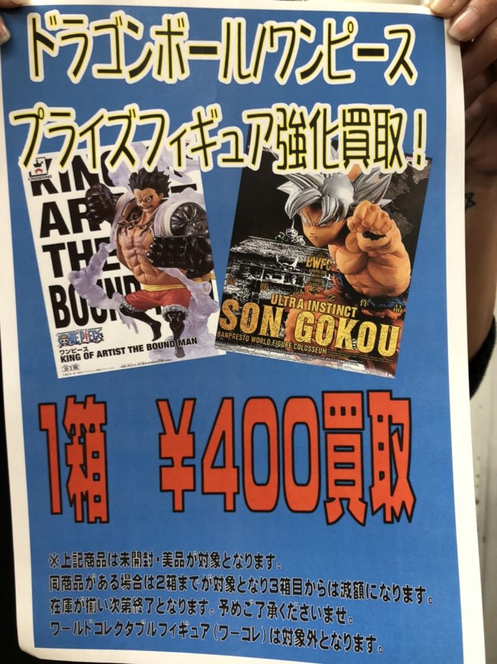 求む!プライズフィギュア! これは熱いと思います! ドラゴンボール、ワンピースのプライズフィギュアを買取かなり強化中!!! 激熱につき早い者勝ちかな… 早期終了の可能性も高いので早めにお持ち頂くことをオススメ…