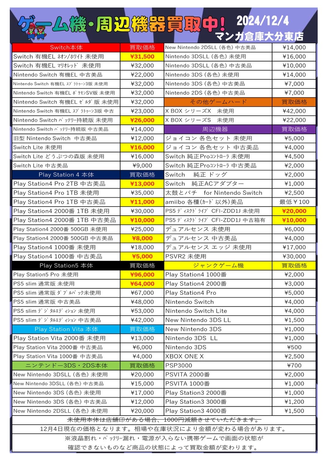 2024.12.10 こんなの買取りました! takalab_2 ■ゲームコーナーから買取商品のご紹介です!■ ゲームコーナーから買取商品のご紹介です! 未使用 Switch 有機EL スプラver 未使用 新型Switch 買取させていただきました! ありがとうございます! まだまだ買取させていただきますので是非、マンガ倉庫大分東店へお持ちくださいませ! ※2024/12/10現在の価格となります。 在庫状況などによってお値段が変動いたします。予めご了承ください。 コメントを残す コメントをキャンセルメールアドレスが公開されることはありません。 ※ が付いている欄は必須項目ですコメント ※ 名前 ※ メール ※ サイト 新しいコメントをメールで通知 新しい投稿をメールで受け取る Δ