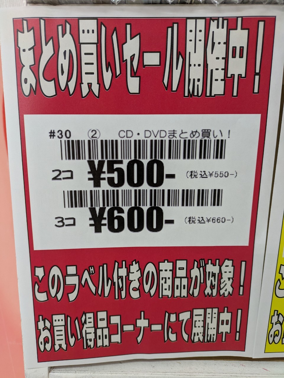 2025.03.03 本・コミック takalab_1 CD·DVDコーナーからお買い得情報です! ただいま売り場にてお買い得コーナーを展開中です! CD·DVDコーナーからお買い得情報です! ただいま売り場にてお買い得コーナーを展開中です! シールが貼られている対象の商品を 1枚購入で300円! 2枚購入で500円! 3枚購入でなんと600円! まとめ買いがよりオトクなコーナーとなっております! この機会にぜひCD·DVDコーナーへお立ち寄りくださいませ! コメントを残す コメントをキャンセルメールアドレスが公開されることはありません。 ※ が付いている欄は必須項目ですコメント ※ 名前 ※ メール ※ サイト 新しいコメントをメールで通知 新しい投稿をメールで受け取る Δ