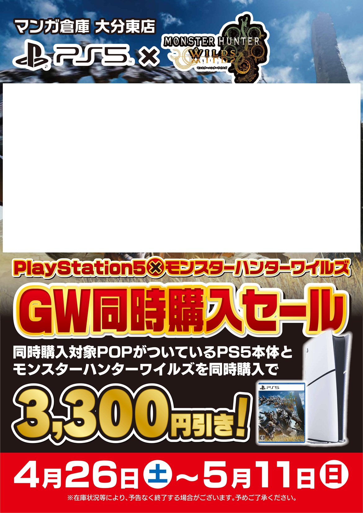 2025.04.26 イベント情報 takalab_2 ■《4月26日~5月11日》ゲームコーナーからセールのお知らせです!■ ゲームコーナーからセールのお知らせです! PS5本体とモンスターハンターワイルズ同時購入で3300円引き! 黄色の同時購入POPが目印です! ぜひ、マンガ倉庫大分東店へお越しくださいませ! コメントを残す コメントをキャンセルメールアドレスが公開されることはありません。 ※ が付いている欄は必須項目ですコメント ※ 名前 ※ メール ※ サイト 新しいコメントをメールで通知 新しい投稿をメールで受け取る Δ