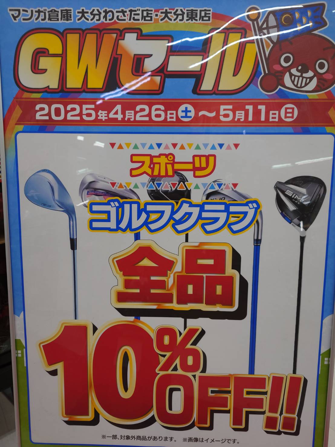 2025.04.26 イベント情報 takalab_2 《4月26日~5月11日》【生活コーナーからGWセールのお知らせ!】 【生活コーナーからGWセールのお知らせ!】 マンガ倉庫大分東店では現在、GWセールを実施中です! 釣具コーナーではロッド・リールがそれぞれ10%オフ! ゴルフコーナーではゴルフクラブが全品10%オフ! 家電コーナーでは、税別3000円以下の商品を2点以上同時購入で、対象商品が全て20%オフ! セール期間は4月26日(土)から5月11日(日)まで!この機会にぜひお買い求めください! 皆様のご来店、心からお待ちしております! コメントを残す コメントをキャンセルメールアドレスが公開されることはありません。 ※ が付いている欄は必須項目ですコメント ※ 名前 ※ メール ※ サイト 新しいコメントをメールで通知 新しい投稿をメールで受け取る Δ