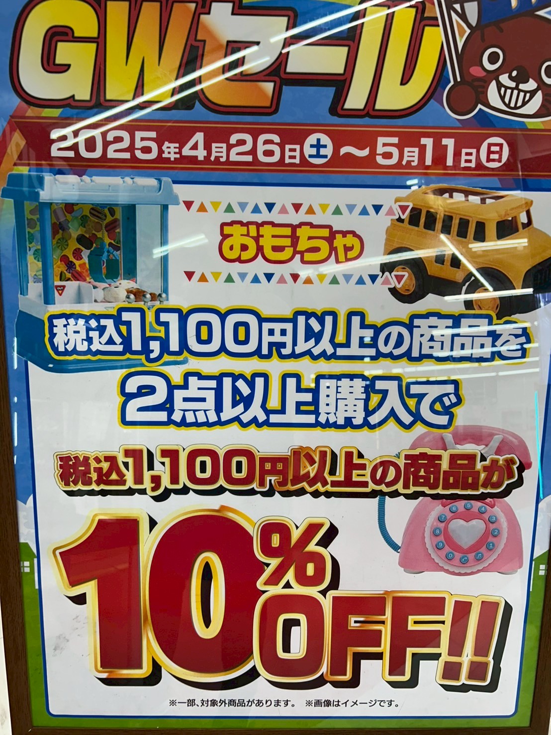 2025.05.05 おもちゃ takalab_5 おもちゃコーナーからゴールデンウィーク中のお得な🉐お知らせ‼️ 入り口入ってすぐ お楽しみ袋がありー そのまま突き進むとおぱんちゃうさぎのガチャガチャ! 期間中は100円🪙 そのまま進む 道なりに右に曲がると すとぷり福袋があるよー! そのままおもちゃコーナーの中に入って ラベルが76の商品は50%OFF 税込1100円以上の商品を2点同時購入で対象商品が10%オフになりまーす♪ 対象外もあります! 店内POPをご覧ください! 色々あるわけさ! 是非東店にご来店ください♪ お待ちしてますね! コメントを残す コメントをキャンセルメールアドレスが公開されることはありません。 ※ が付いている欄は必須項目ですコメント ※ 名前 ※ メール ※ サイト 新しいコメントをメールで通知 新しい投稿をメールで受け取る Δ