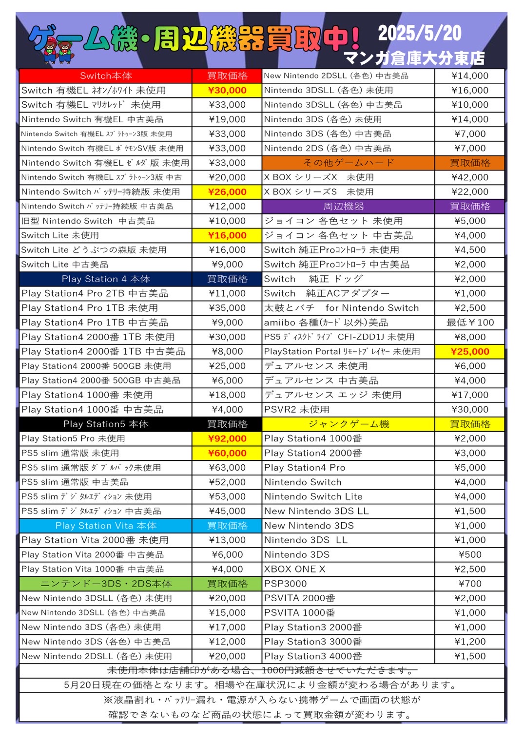 2025.05.20 買取情報 takalab_5 ◆ゲームコーナーから買取告知のお知らせです!◆ ゲームコーナーから買取告知のお知らせです!🎮🎮 ぜひ、マンガ倉庫大分東店へお持ちくださいませ! ※2025/5/20現在の価格となります。 在庫状況・状態によってお値段が変動いたします。予めご了承ください。 **************** こちら↓もぜひチェックしてみてくださいね♪(*´▽`*) ・最新のイベント情報はこちら ・最新の買取情報はこちら コメントを残す コメントをキャンセルメールアドレスが公開されることはありません。 ※ が付いている欄は必須項目ですコメント ※ 名前 ※ メール ※ サイト 新しいコメントをメールで通知 新しい投稿をメールで受け取る Δ