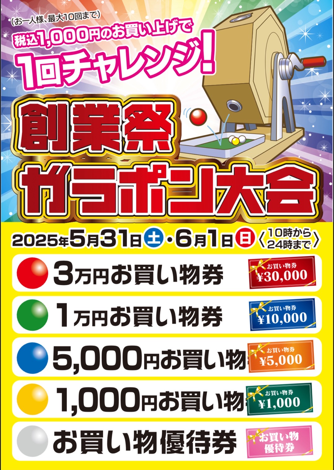 2025.05.31 イベント情報 takalab_5 《5/31~6/1》【創業祭ガラポン開催中!】 【創業祭だよ!全員集合!】 5月31日と6月1日だけの限定創業祭ガラポン開催中! 景品は最大3万円分のお買い物券が当たる大チャンス!? お買い上げ1000円以上のレシートで参加可能! 是非当店の創業祭ガラポンご参加ください! ご来店お待ちしております! **************** こちら↓もぜひチェックしてみてくださいね♪(*´▽`*) ・最新のイベント情報はこちら ・最新の買取情報はこちら コメントを残す コメントをキャンセルメールアドレスが公開されることはありません。 ※ が付いている欄は必須項目ですコメント ※ 名前 ※ メール ※ サイト 新しいコメントをメールで通知 新しい投稿をメールで受け取る Δ