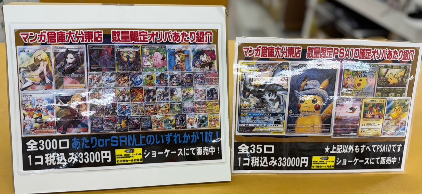 2025.05.31 カード takalab_5 🌟カードコーナーからオリジナルパックのご紹介です!🌟 🌟カードコーナーからオリジナルパックのご紹介です!🌟 必ずPSA10が当たるパックとあたりor SR以上が1枚出てくる2種類を販売中です! 是非、マンガ倉庫大分東店へお越しくださいませ! コメントを残す コメントをキャンセルメールアドレスが公開されることはありません。 ※ が付いている欄は必須項目ですコメント ※ 名前 ※ メール ※ サイト 新しいコメントをメールで通知 新しい投稿をメールで受け取る Δ