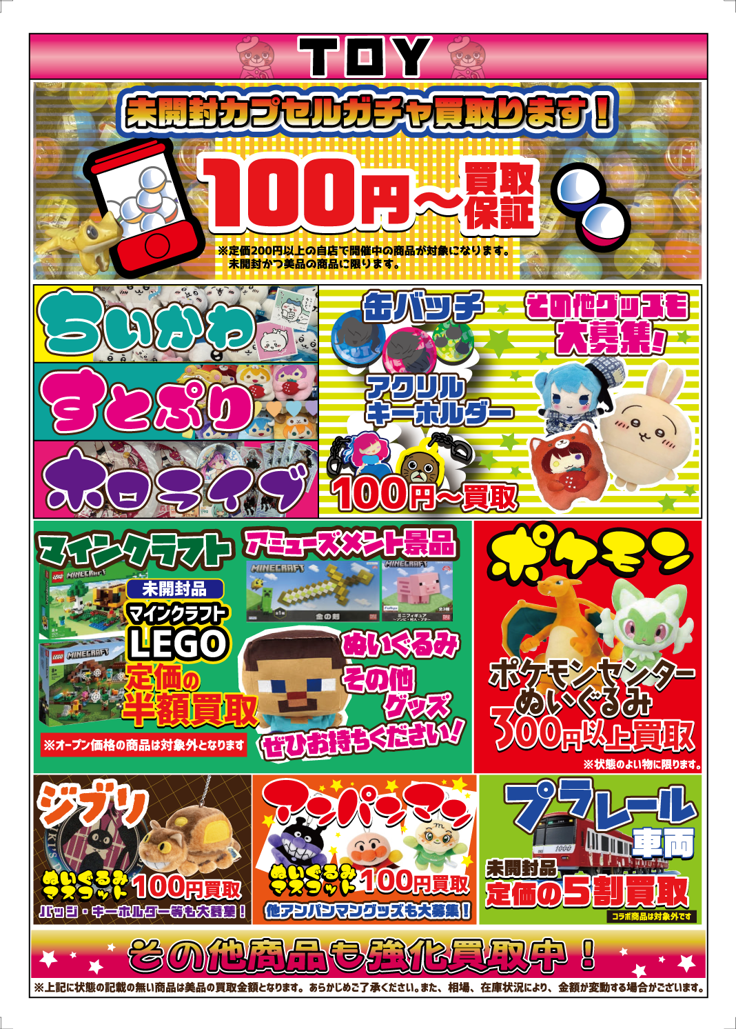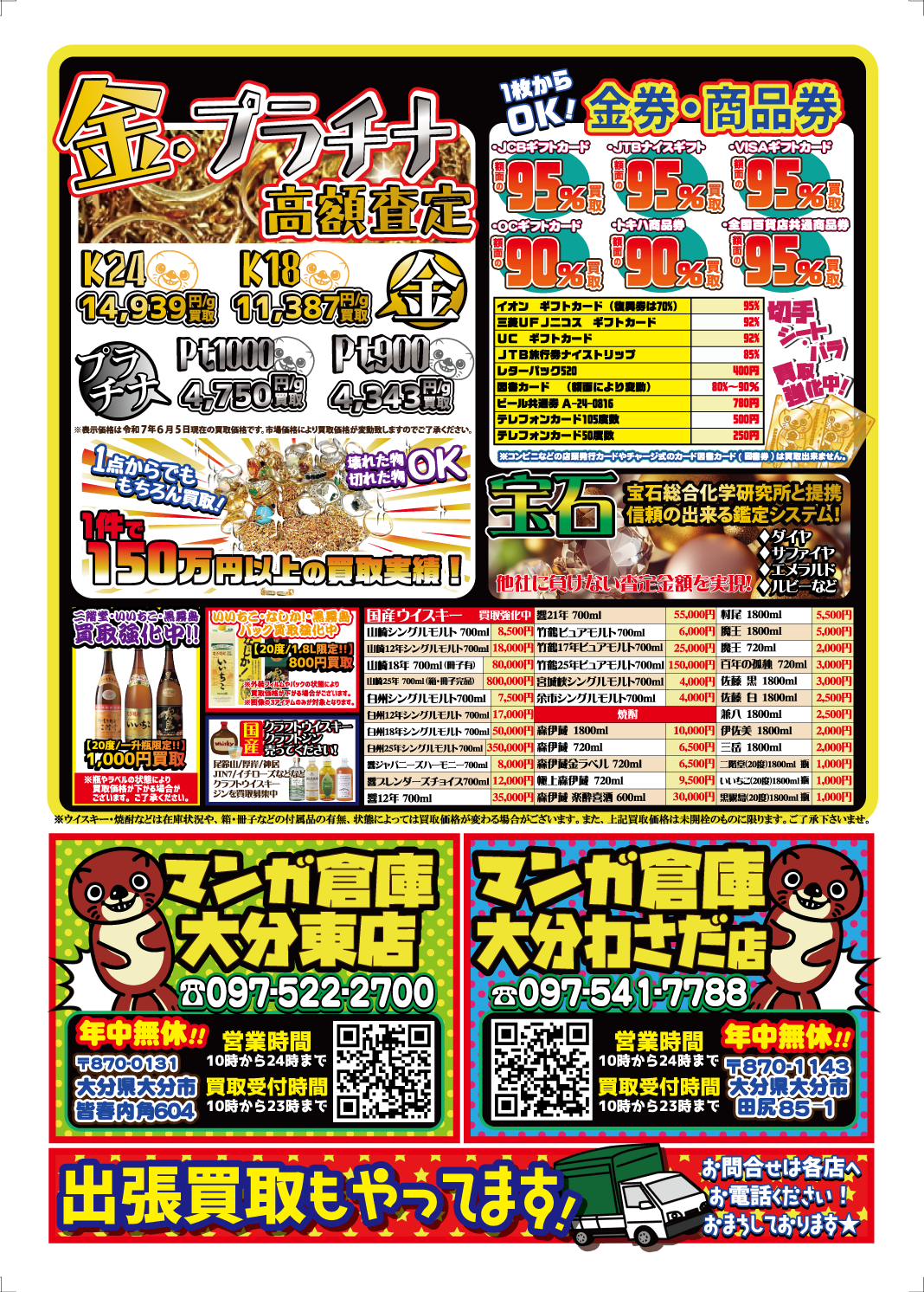 2025.07.01 買取情報 takalab_6 お宝買取!!【虎の巻7月号】できました! ✨お宝買取虎の巻7月号ができました!✨ WEBチラシにも一緒に掲載しておりますので、そちらもご覧ください! 2025年7月1日現在の価格なので、 最新の価格はWEBチラシバナーをタップしてご確認ください! ★2025/7/1 発行★ コメントを残す コメントをキャンセルメールアドレスが公開されることはありません。 ※ が付いている欄は必須項目ですコメント ※ 名前 ※ メール ※ サイト 新しいコメントをメールで通知 新しい投稿をメールで受け取る Δ