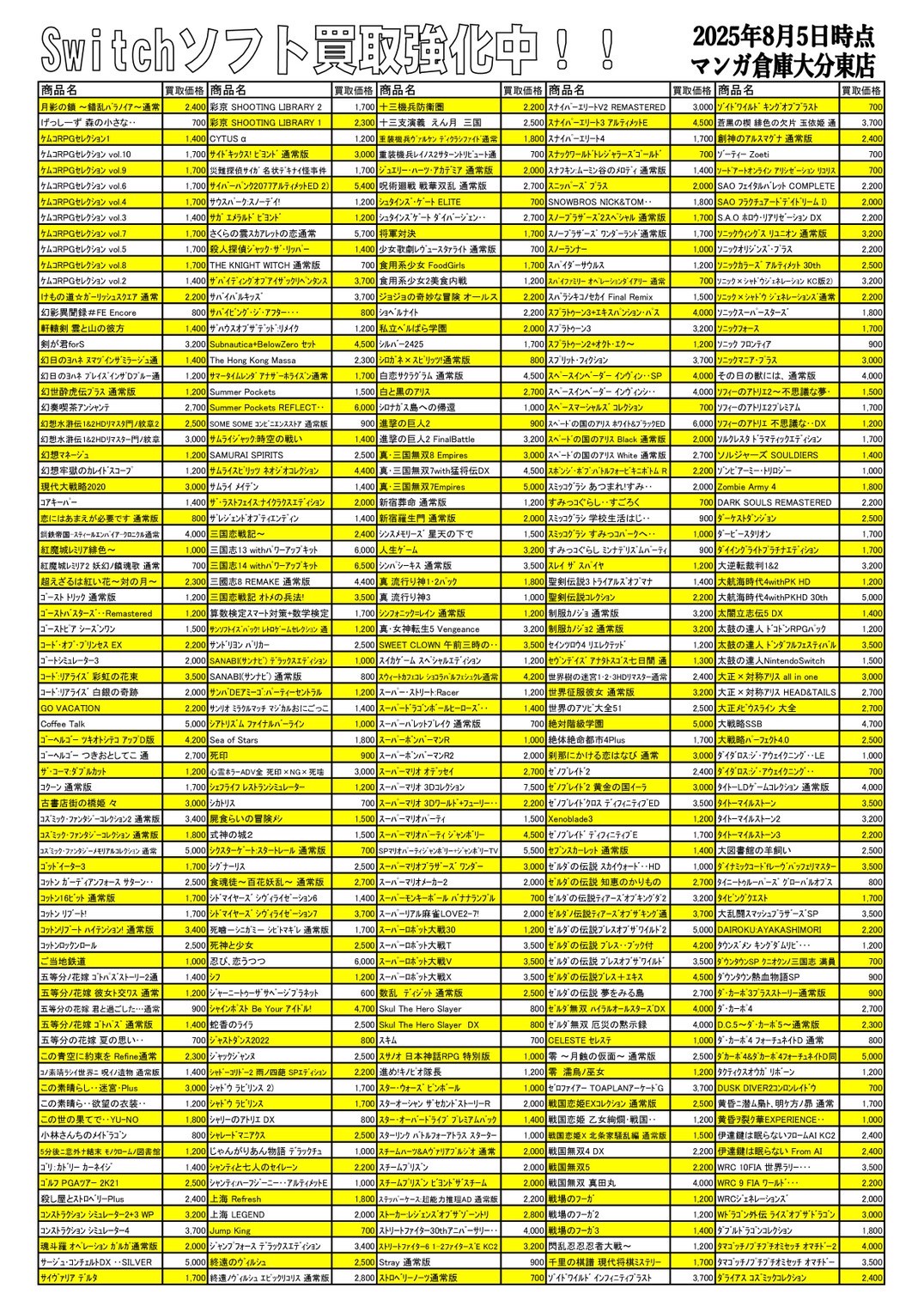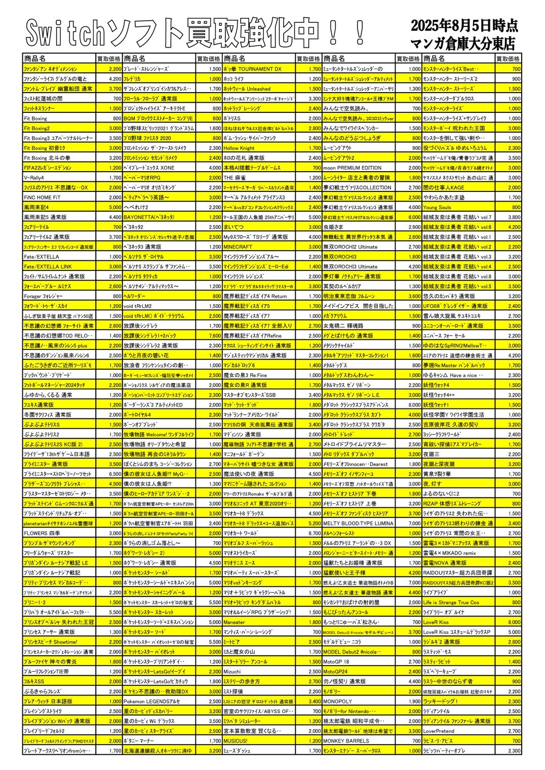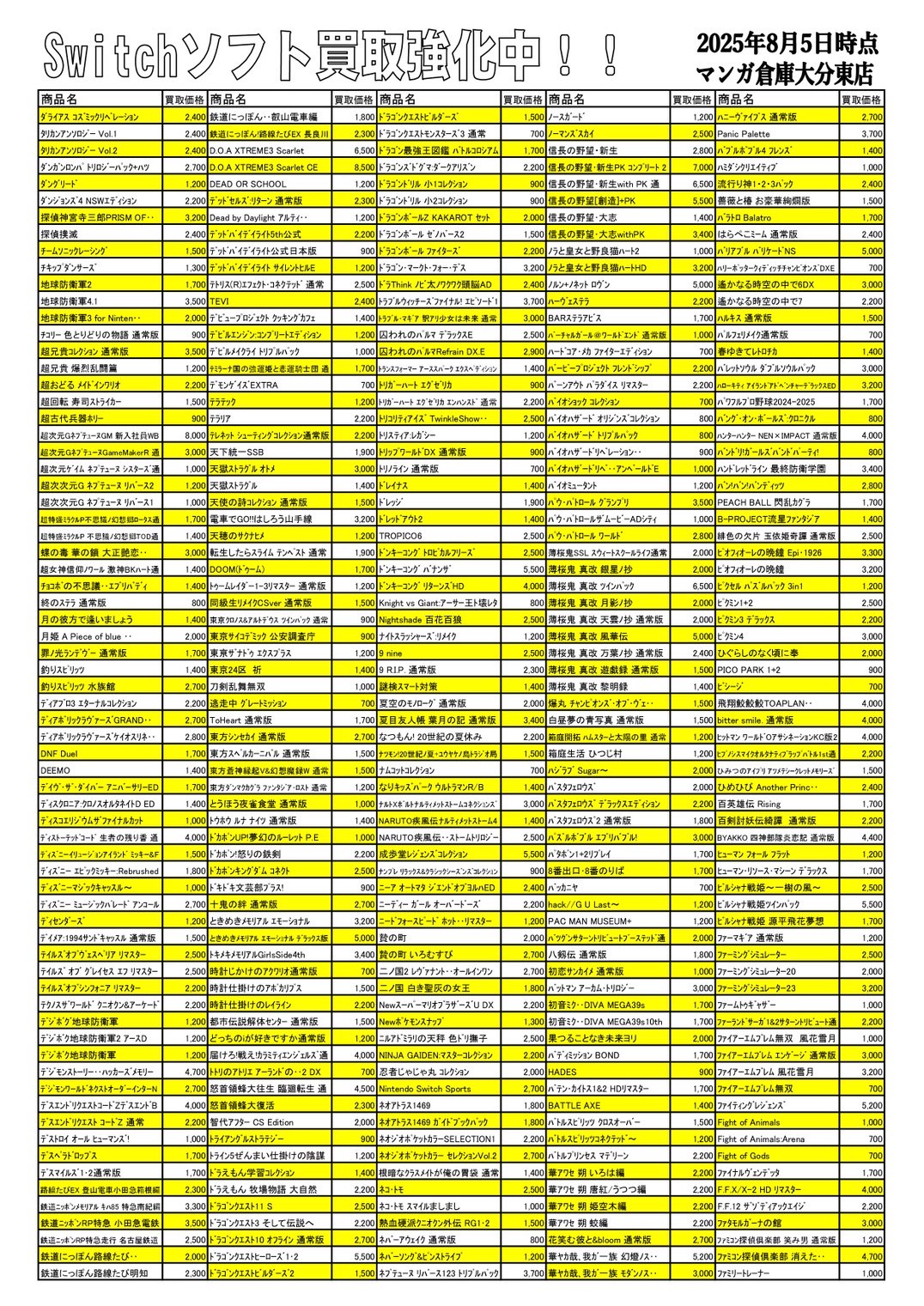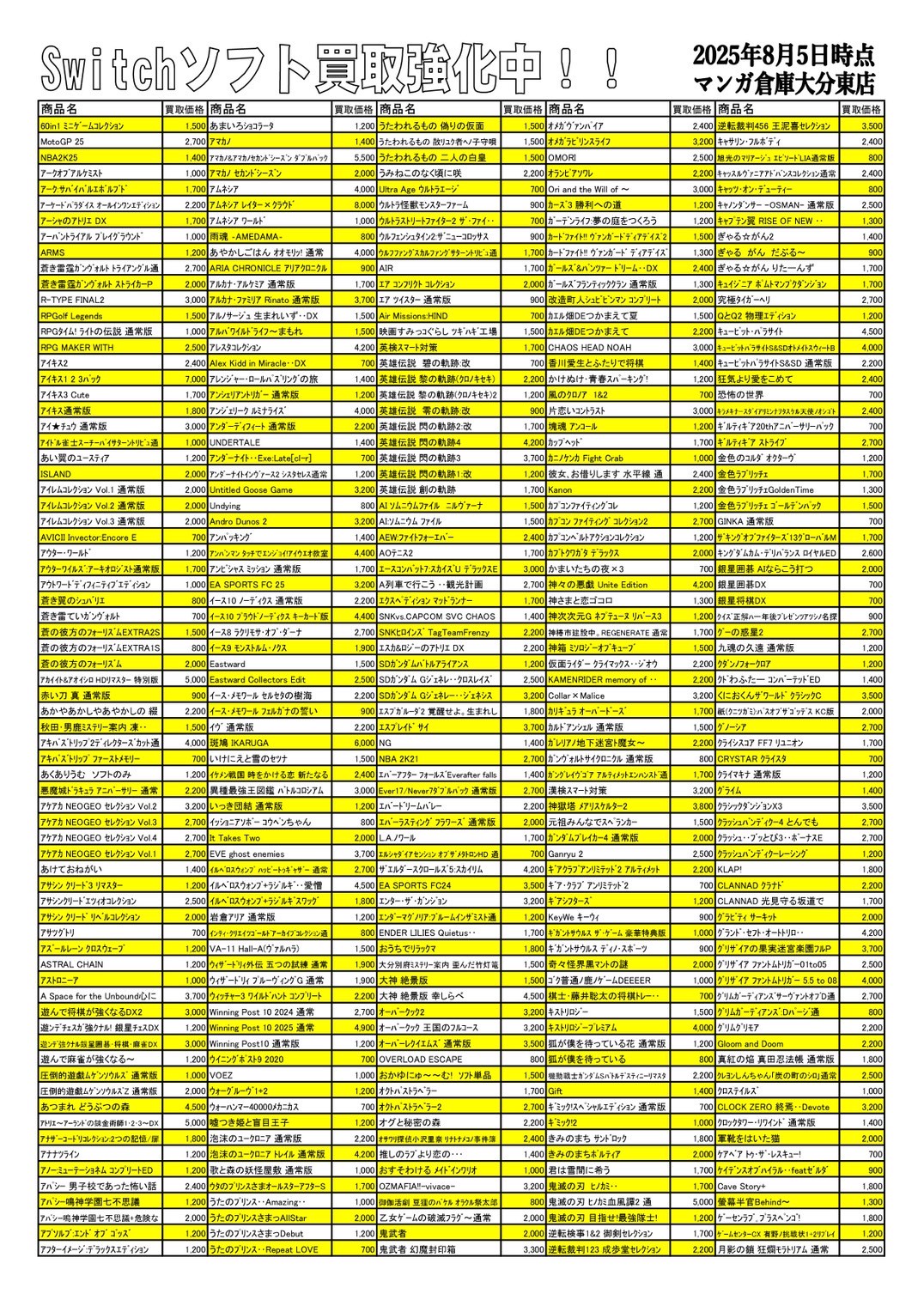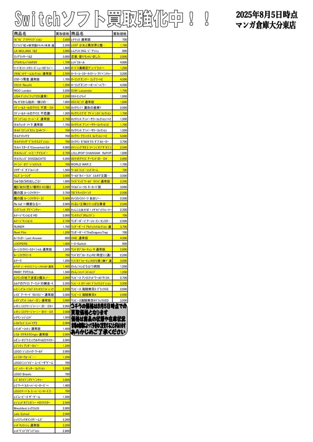 2025.08.09 買取情報 takalab_3 ゲームコーナーから買取告知のお知らせです! ゲームコーナーから買取告知のお知らせです! 是非、マンガ倉庫大分東店へお持ちくださいませ! ※2025/8/9現在の価格となります。 在庫状況・状態によってお値段が変動いたします。予めご了承ください。 **************** こちら↓もぜひチェックしてみてくださいね♪(*´▽`*) ・最新のイベント情報はこちら ・最新の買取情報はこちら コメントを残す コメントをキャンセルメールアドレスが公開されることはありません。 ※ が付いている欄は必須項目ですコメント ※ 名前 ※ メール ※ サイト 新しいコメントをメールで通知 新しい投稿をメールで受け取る Δ