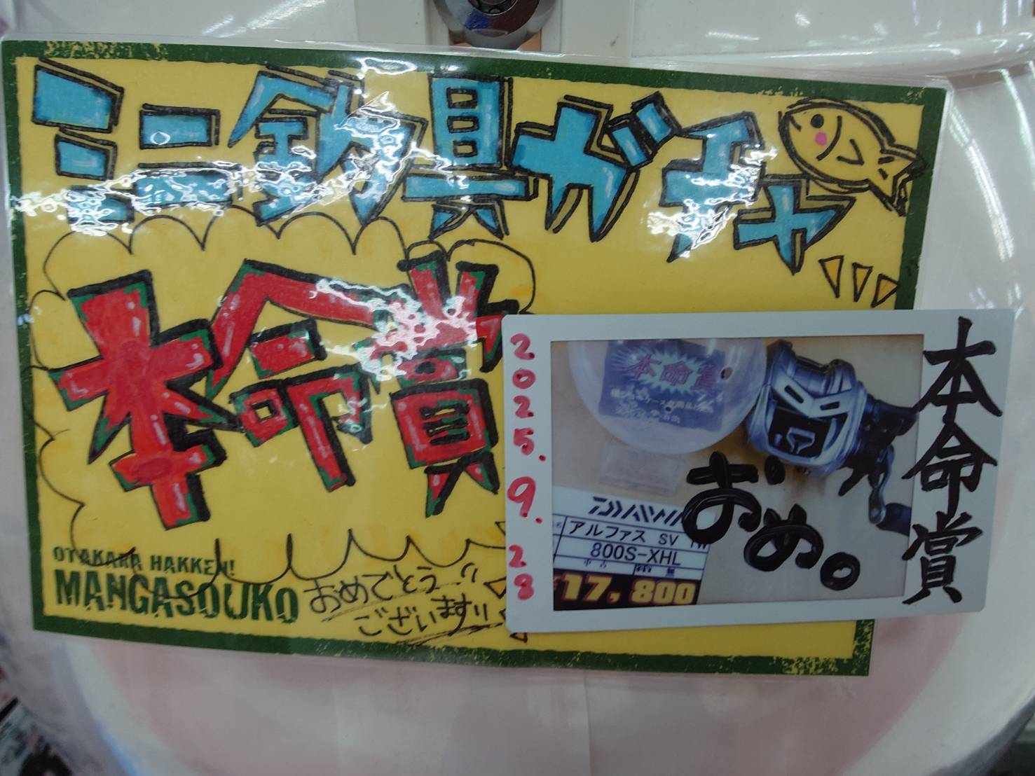 2025.09.30 ガチャ takalab_6 【釣具コーナーよりガチャご当選のお知らせ!】 当店釣具コーナーで稼働中の釣具ガチャにて、本命賞が当たりました! 景品は[アルファスSV TW 800S-XHL]をお選びいただきました! ご当選されたお客様、おめでとうございます! こちらのガチャは500円で1回チャレンジでき、本命賞が当たれば隣接しているショーケースの中の商品1点と交換できます! また、ハズレの外道賞でも税抜500円以内の釣具コーナー商品と交換できるため、損をしないガチャとなっております! 稼働は既に再開しております! 皆様のチャレンジ、お待ちしております! コメントを残す コメントをキャンセルメールアドレスが公開されることはありません。 ※ が付いている欄は必須項目ですコメント ※ 名前 ※ メール ※ サイト 新しいコメントをメールで通知 新しい投稿をメールで受け取る Δ