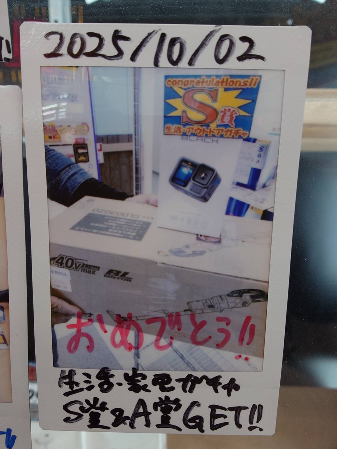 2025.10.03 ガチャ takalab_2 【生活コーナーよりガチャ当選のお知らせ!】 【生活コーナーよりガチャ当選のお知らせ!】 当店入口で開催中の生活・雑貨ガチャでS賞が当選致しました!景品は[Go Pro13 BLACK]をお選びいただきました! おめでとうございます! 今回お選び頂いた景品の他にもテレビや釣具・アップル製品など豪華な景品を多数取り揃えております! 稼働は既に再開しております!ぜひ当店入口で生活・雑貨ガチャをお試しください! 皆様のご来店、心からお待ちしております! コメントを残す コメントをキャンセルメールアドレスが公開されることはありません。 ※ が付いている欄は必須項目ですコメント ※ 名前 ※ メール ※ サイト 新しいコメントをメールで通知 新しい投稿をメールで受け取る Δ
