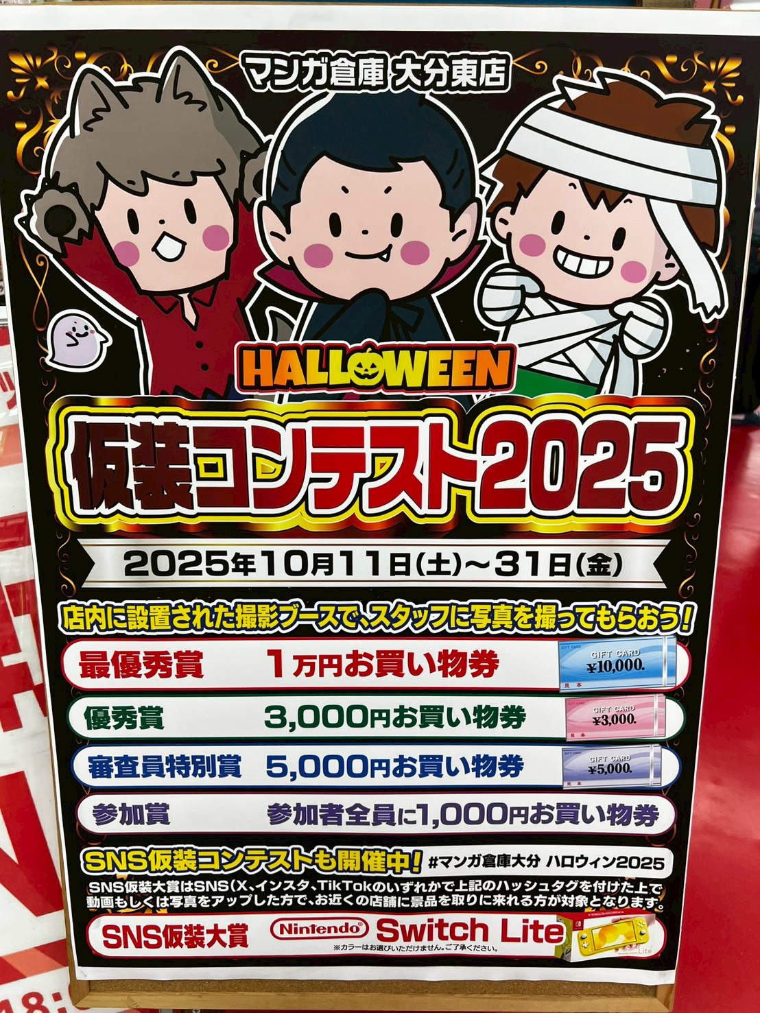 X、Instagram、TikTokに#マンガ倉庫大分 ハロウィン2025を付けてUPしてSNS仮装大賞に選ばれるとSwitch rightが貰える🎃