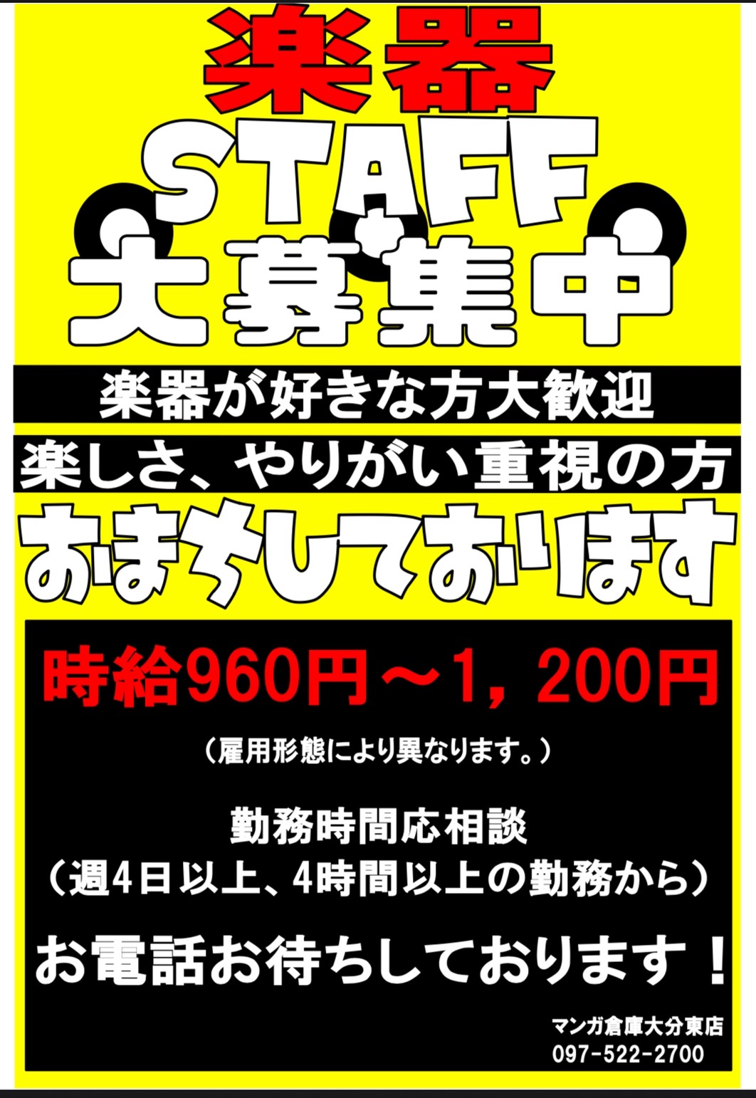 2025.10.24 楽器 takalab_2 【楽器担当募集!!】 【楽器担当募集!!】 今回マンガ倉庫大分東店では楽器担当を募集中! 楽器が好きな方! 楽しさ•やりがい重視の方! を募集しています! 週4以上、4時間以上の勤務ができる方ご連絡お待ちしております! LINEで募集すると枠が一気に埋まる場合もありますのでお早めのご連絡お待ちしてます! 応募の際楽器担当募集のLINEを見ましたと伝えていただけると受付がスムーズです。 ご連絡お待ちしております! コメントを残す コメントをキャンセルメールアドレスが公開されることはありません。 ※ が付いている欄は必須項目ですコメント ※ 名前 ※ メール ※ サイト 新しいコメントをメールで通知 新しい投稿をメールで受け取る Δ