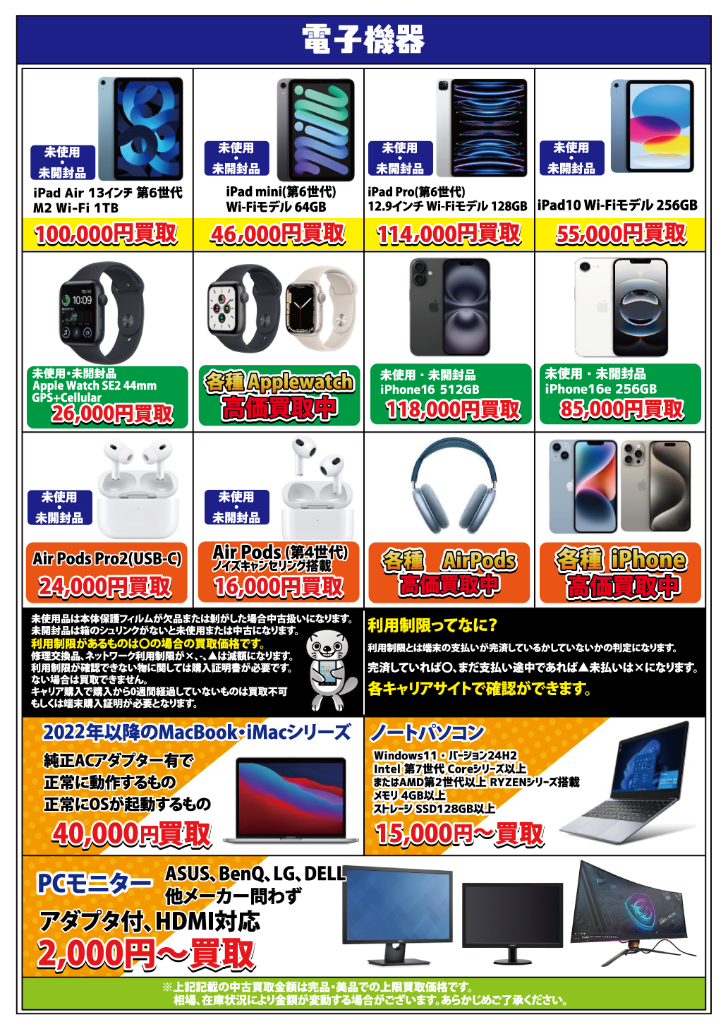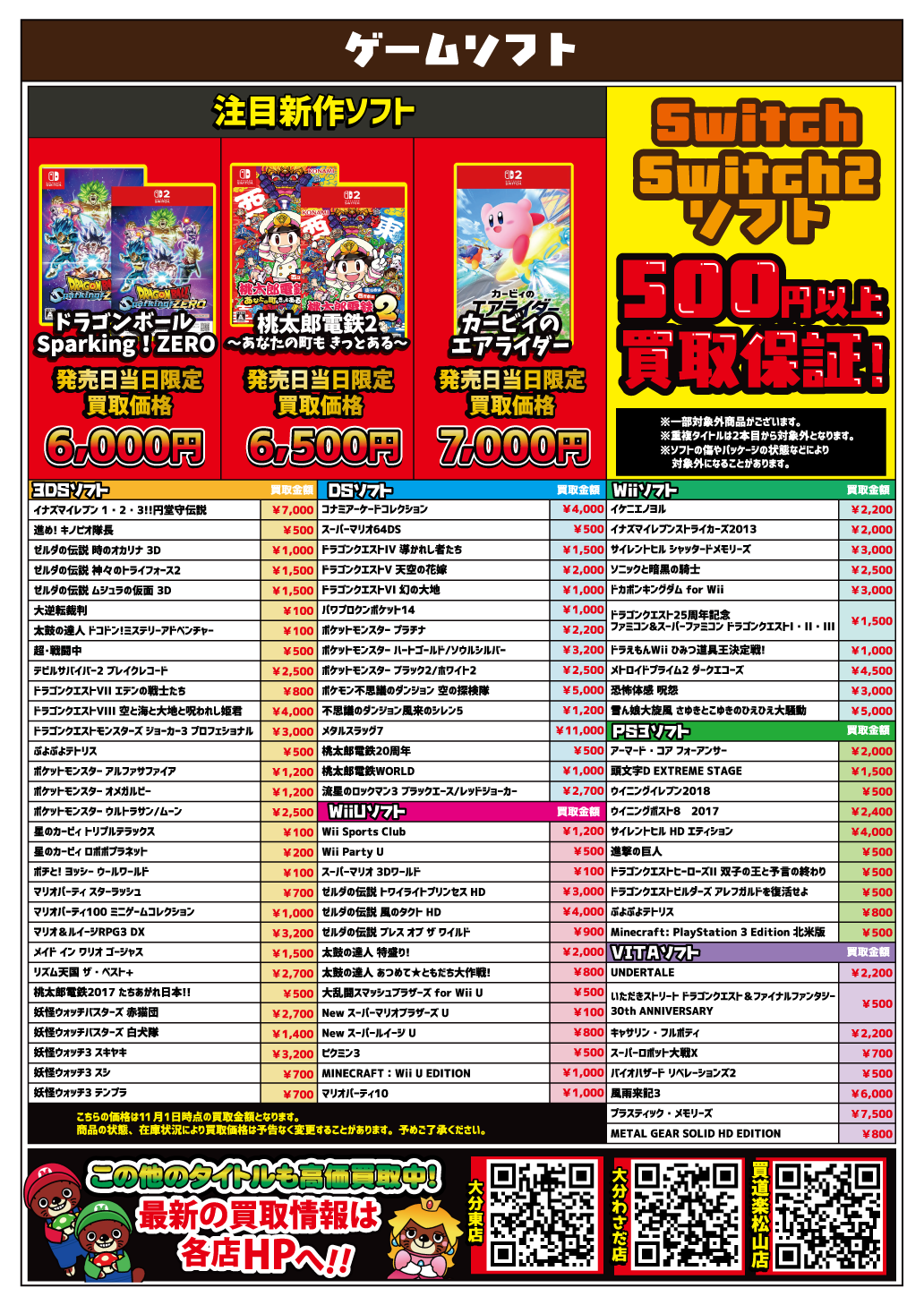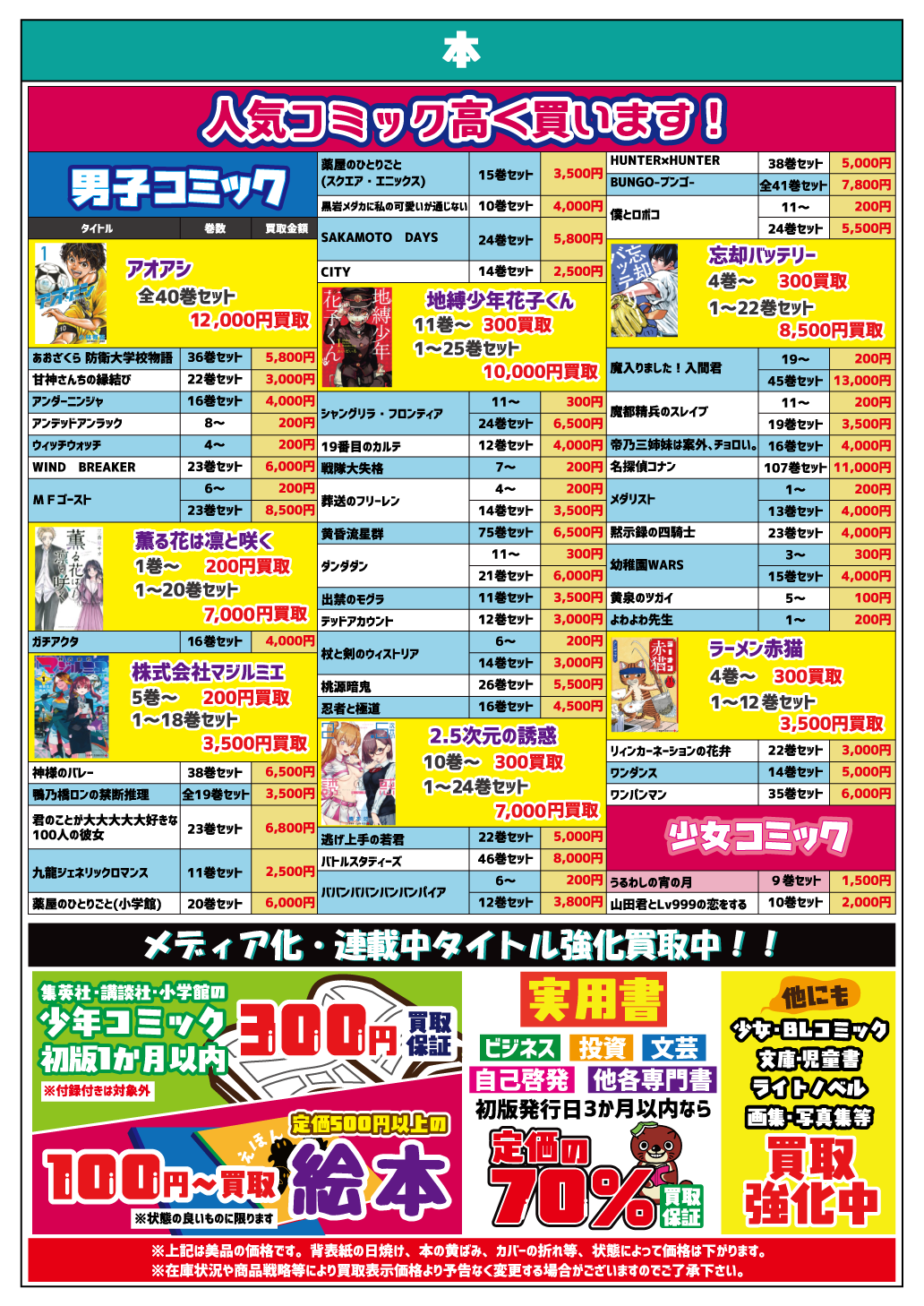 2025.11.01 買取情報 takalab_5 お宝買取!!【虎の巻11月号】できました! ✨お宝買取虎の巻11月号ができました!✨ WEBチラシにも一緒に掲載しておりますので、そちらもご覧ください! 2025年11月1日現在の価格なので、 最新の価格はWEBチラシバナーをタップしてご確認ください! ★2025/11/1 発行★ コメントを残す コメントをキャンセルメールアドレスが公開されることはありません。 ※ が付いている欄は必須項目ですコメント ※ 名前 ※ メール ※ サイト 新しいコメントをメールで通知 新しい投稿をメールで受け取る Δ