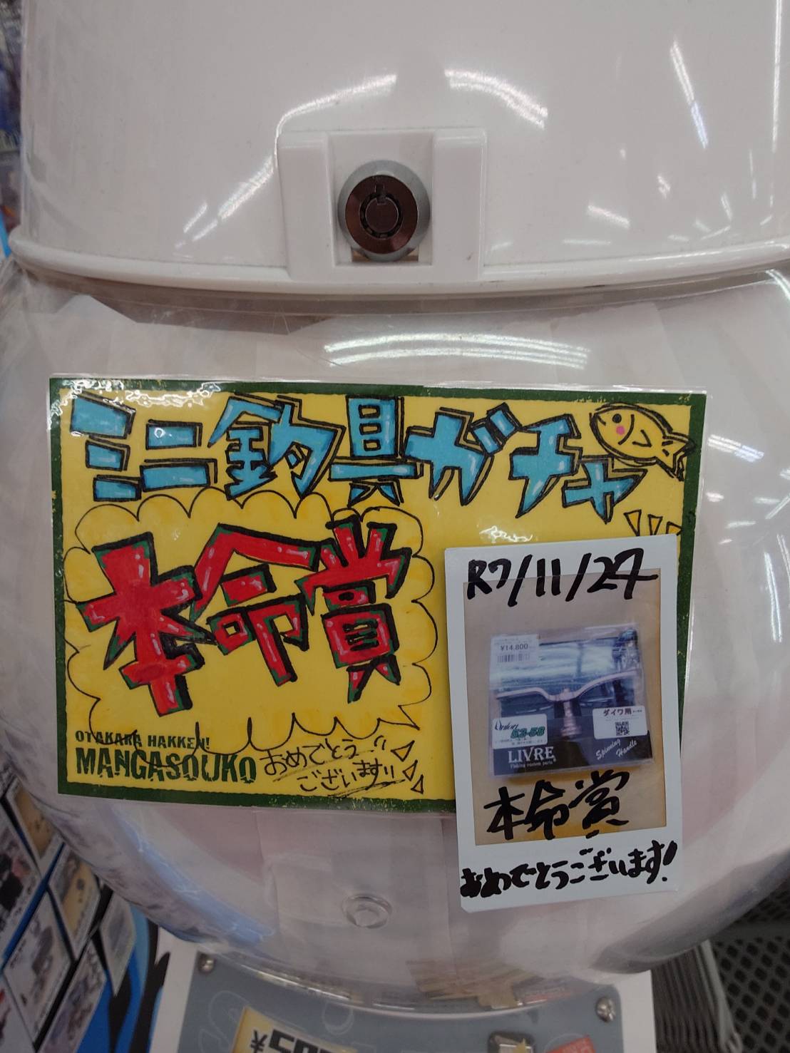 2025.11.25 ガチャ takalab_6 【釣具コーナーよりガチャご当選のお知らせ!】 当店釣具コーナーで稼働中の釣具ガチャにて、本命賞が当たりました! 景品は[LIVRE ユニオン 52-58]をお選びいただきました! ご当選されたお客様、おめでとうございます! こちらのガチャは500円で1回チャレンジでき、本命賞が当たれば隣接しているショーケースの中の商品1点と交換できます! また、ハズレの外道賞でも税抜500円以内の釣具コーナー商品と交換できるため、損をしないガチャとなっております! 稼働は既に再開しております! 皆様のチャレンジ、お待ちしております! コメントを残す コメントをキャンセルメールアドレスが公開されることはありません。 ※ が付いている欄は必須項目ですコメント ※ 名前 ※ メール ※ サイト 新しいコメントをメールで通知 新しい投稿をメールで受け取る Δ