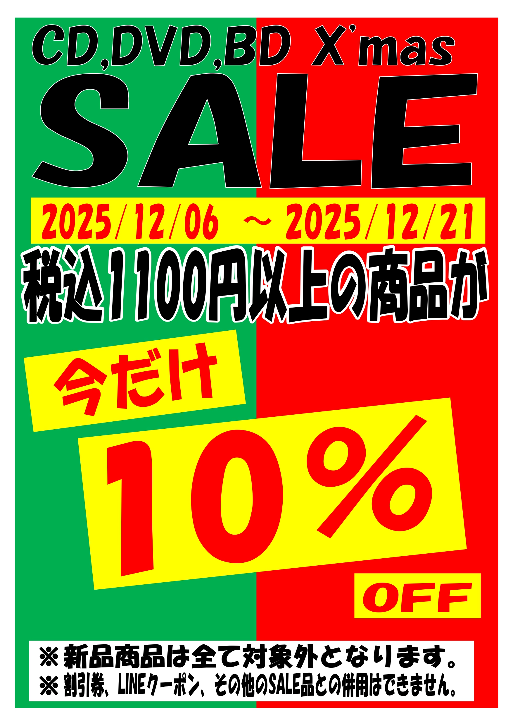 2025.12.06 イベント情報 takalab_1 CD·DVDコーナーからお買い得情報です!12/21までの期間限定!クリスマスセールを開催中! CD·DVDコーナーからお買い得情報です! ただいま売り場にてクリスマスセールを開催中です! 税込1100円以上の中古のCD·DVD·Blu-ray商品が今だけ10%OFF!! 12/21までの期間限定! ぜひCD·DVDコーナーへお立ち寄りくださいませ! **************** こちら↓もぜひチェックしてみてくださいね♪(*´▽`*) ・最新のイベント情報はこちら ・最新の買取情報はこちら コメントを残す コメントをキャンセルメールアドレスが公開されることはありません。 ※ が付いている欄は必須項目ですコメント ※ 名前 ※ メール ※ サイト 新しいコメントをメールで通知 新しい投稿をメールで受け取る Δ