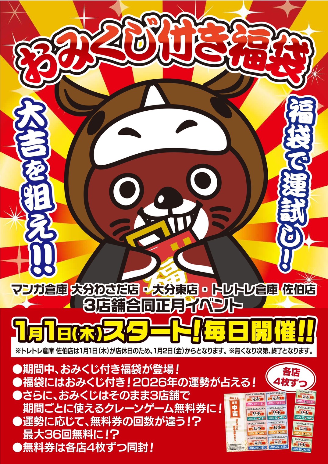 無料券はマンガ倉庫東店・わさだ・トレトレ倉庫佐伯店の各4枚ずつ入ってます