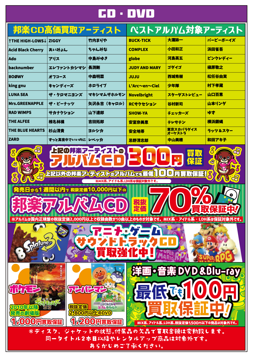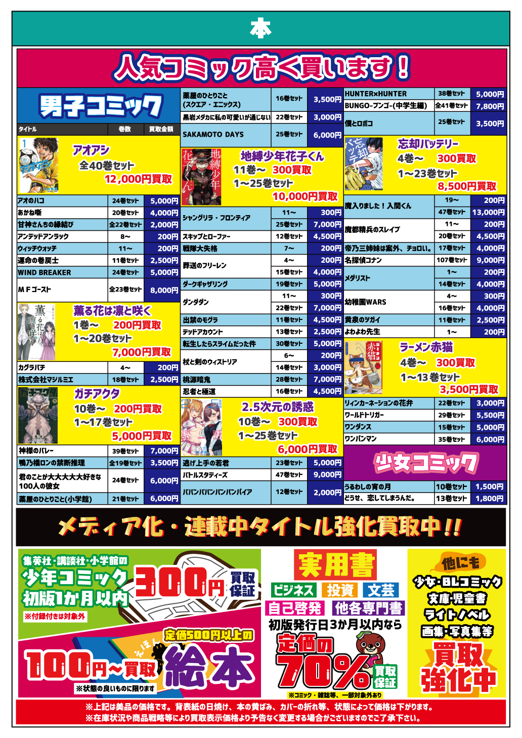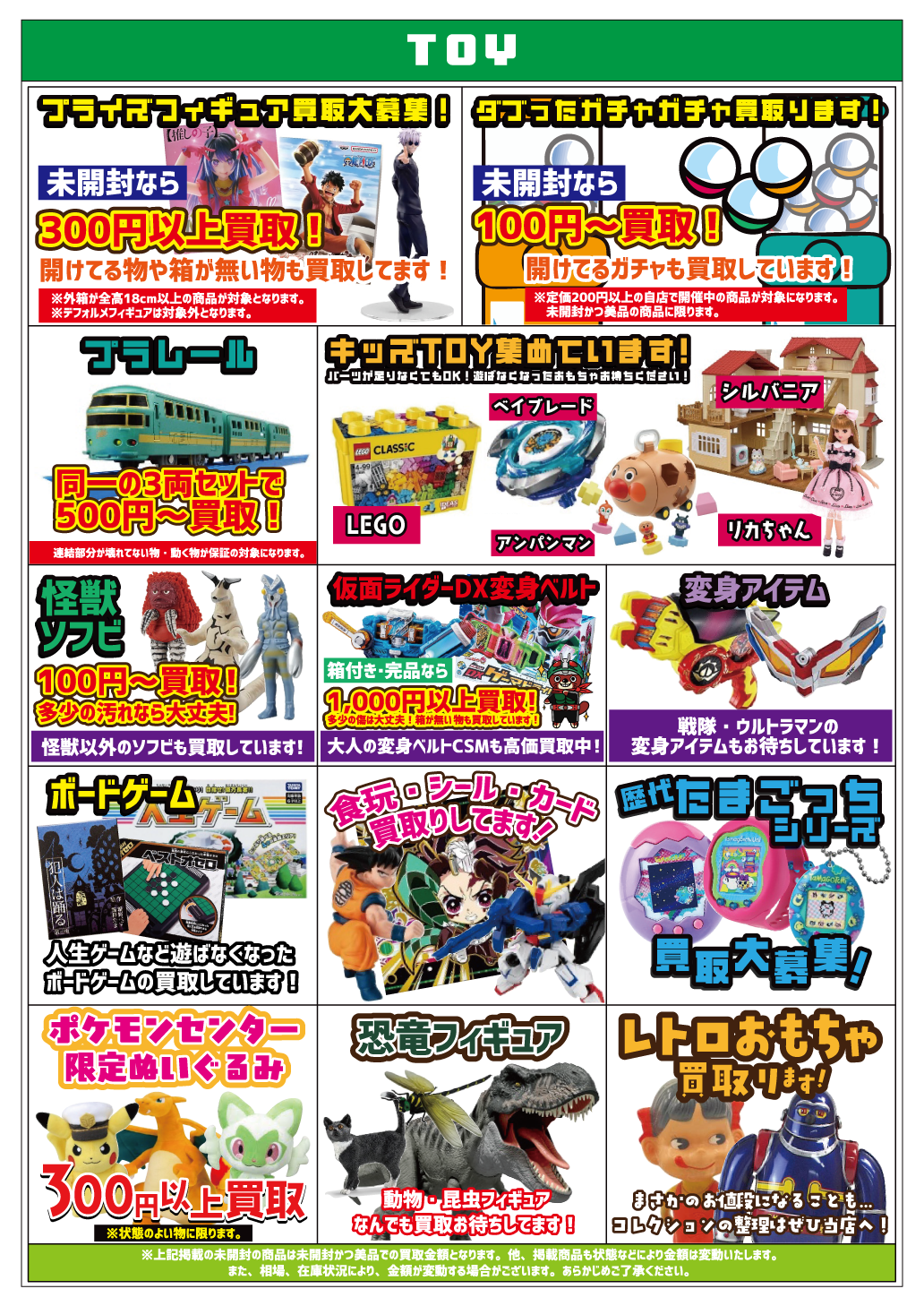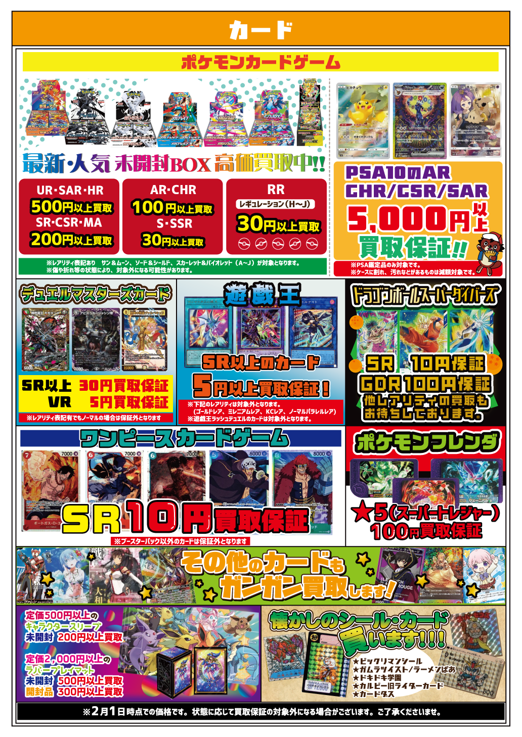 2026.02.01 買取情報 takalab_4 お宝買取!!【虎の巻2月号】できました! ✨お宝買取虎の巻2月号ができました!✨ WEBチラシにも一緒に掲載しておりますので、そちらもご覧ください! 2026年2月1日現在の価格なので、 最新の価格はWEBチラシバナーをタップしてご確認ください! ★2026/2/1 発行★ コメントを残す コメントをキャンセルメールアドレスが公開されることはありません。 ※ が付いている欄は必須項目ですコメント ※ 名前 ※ メール ※ サイト 新しいコメントをメールで通知 新しい投稿をメールで受け取る Δ
