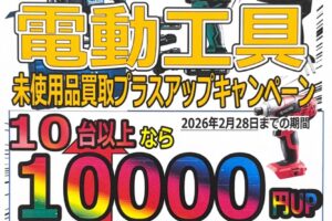 「電動工具売るなら今っ!!」 未使用電動工具のプラス始めちゃいますよ! しかし期間は2月28日まで! Panasonic、RYOBI、マキタ、ハイコーキの未使用電動工具を複数持ち込みで査定金額からさらにプラスアップ!! …