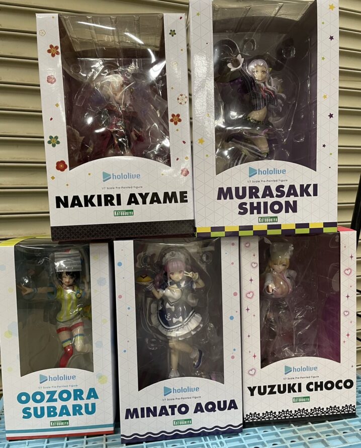 フィギュアのコーナーから買取情報です! 今回の買取は前回のポッパレから引き続き、ホロライブのフィギュアたちです! どうですか、この面子! コトブキヤ製のスケールフィギュアたちを買い取らせていただきました! 大空スバル、湊…