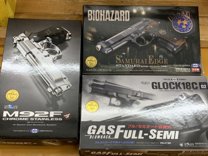 エアガン買取させていただきました! 東京マルイのガスハンドガンから3点! M92Fクロームステンレス サムライエッジ スタンダードモデル〈ハイグレードタイプ〉 グロック18C 次世代電動ガンとボルトアクションライフルも買…