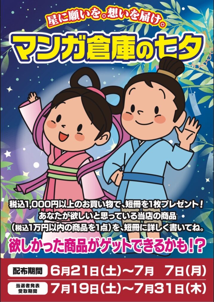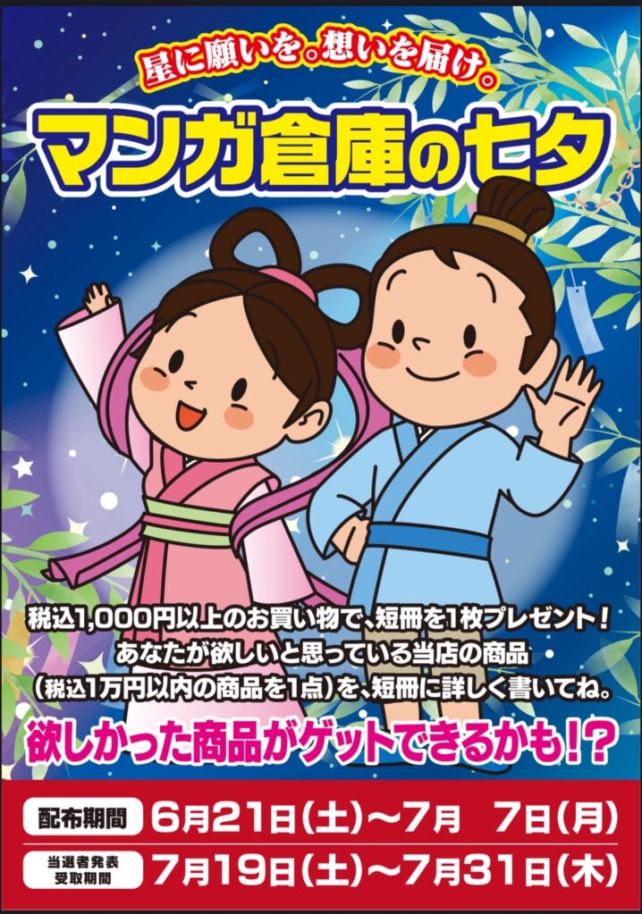 イベント情報です🥳 只今マンガ倉庫大分では七夕イベント開催中です🤩✨ 短冊に願い事と欲しい商品(税込1万円以内)を書いて竹に飾ると抽選で欲しい商品がもらえるかも⁉…
