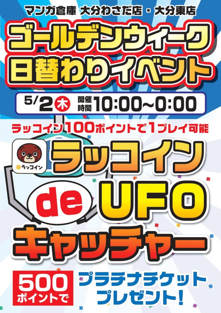 ゴールデンウィーク日替わりイベント6日目になりました(pq´v`*)♪ 5月2日はラッコインdeUFOキャッチャー✨ 100ラッコインポイントで1プレイ♪ さらに500ラッコインポイントでプラチナチケットプ…