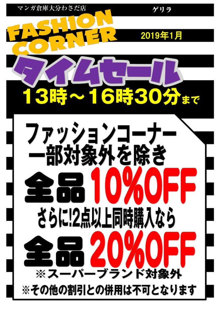 ファッションコーナーからとってもお買い得なタイムセールのお知らせです! 本日の13時から16時30分までの間タイムセールを開催致します! なんと全品10%OFF! さらに2点以上同時購入の場合は全品20%OFF!! 組み…