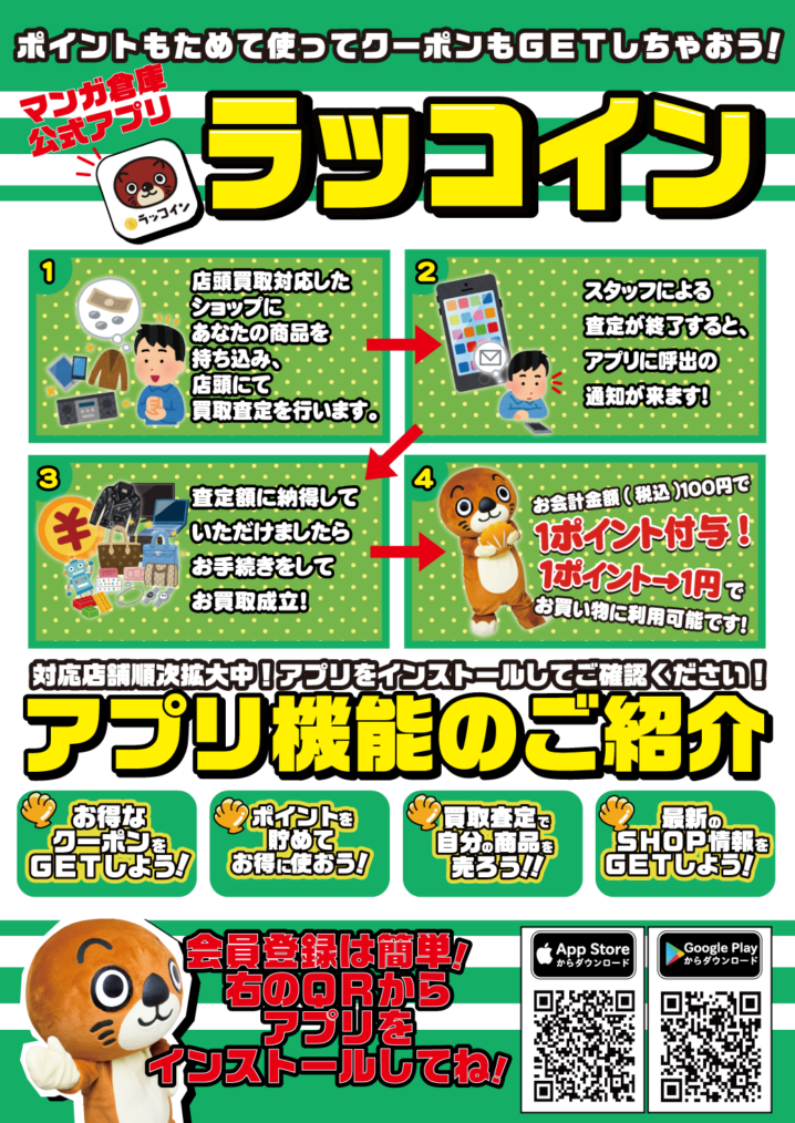 マンガ倉庫をより楽しめるアプリ【ラッコイン】が登場しました(^▽^)/★ ポイントを貯めて使ってクーポンもGETしちゃおう! 買取査定が終わったら通知も届きます! お買物しながら査定待ちも楽々♪ お会計金額によってポイン…