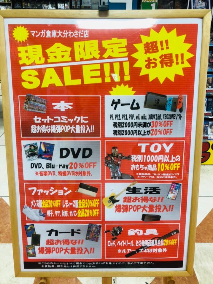 昨日からマンガ倉庫大分わさだ店では、現金限定セールを開催しております!(^ω^) 現金でのお支払いのみのセールになりますので、あらかじめご了承ください! お得な内容になっておりますので是非ご来店ください!(°▽°) お待…