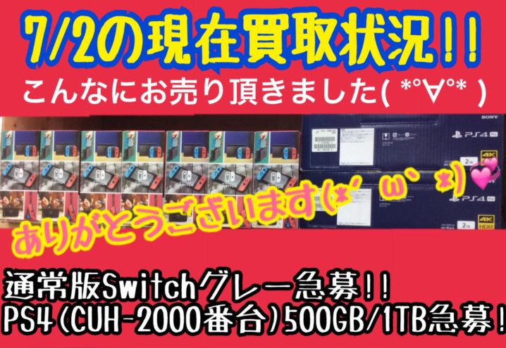 Nintendo Switch通常版グレー PS4(CUH-2000番台)500GB/1TB 大募集中です!!! 買わせてくださいっ!!! 告知を叫んだところで、本日買い取らせていただいた未使用ゲーム機はこちら…