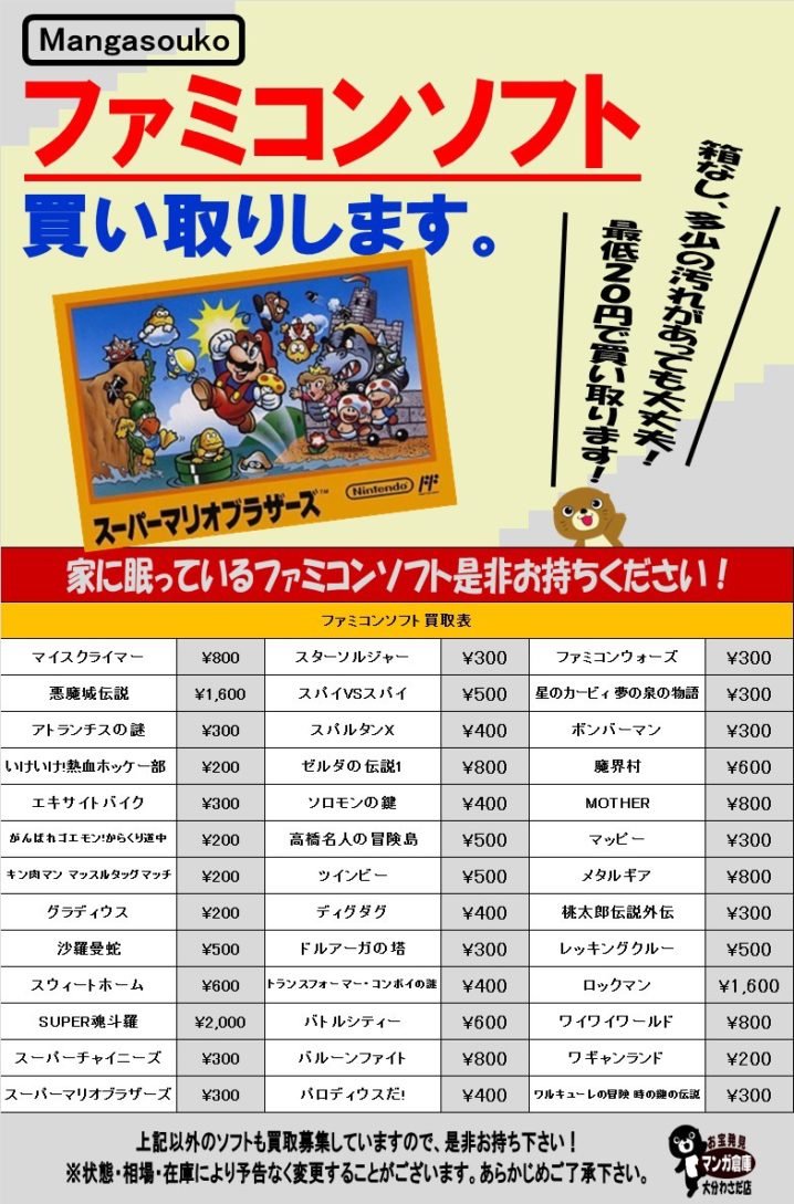 ゲームコーナーより マンガ倉庫大分わさだ店ではファミコンソフト買取強化中です‼️✨ 家に眠っているファミコンソフトがありましたら、是非当店にお持ち下さい‼þ…