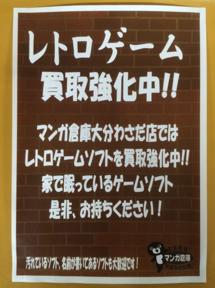 マンガ倉庫大分わさだ店ではレトロゲームを買取強化中です! 名前が書いてあるソフトも大歓迎です✨ 家に眠っているレトロゲーム、是非当店にお持ち下さい! 皆様からの買取ジャンジャンお持ちしております(`・ω・´…