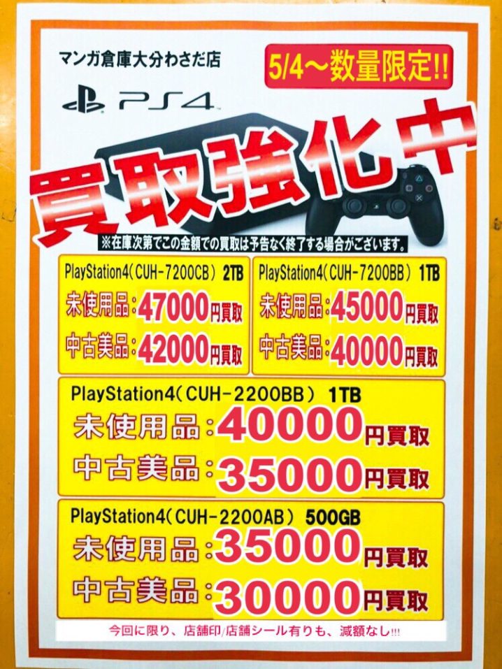PS4を数量限定で買取金額UPしたところ、 昨日は5台も買い取らせて頂きました❤️❤️ 気になる買取金額はこちら!! 数量限定でいつもより5000円高く買い取らせて…