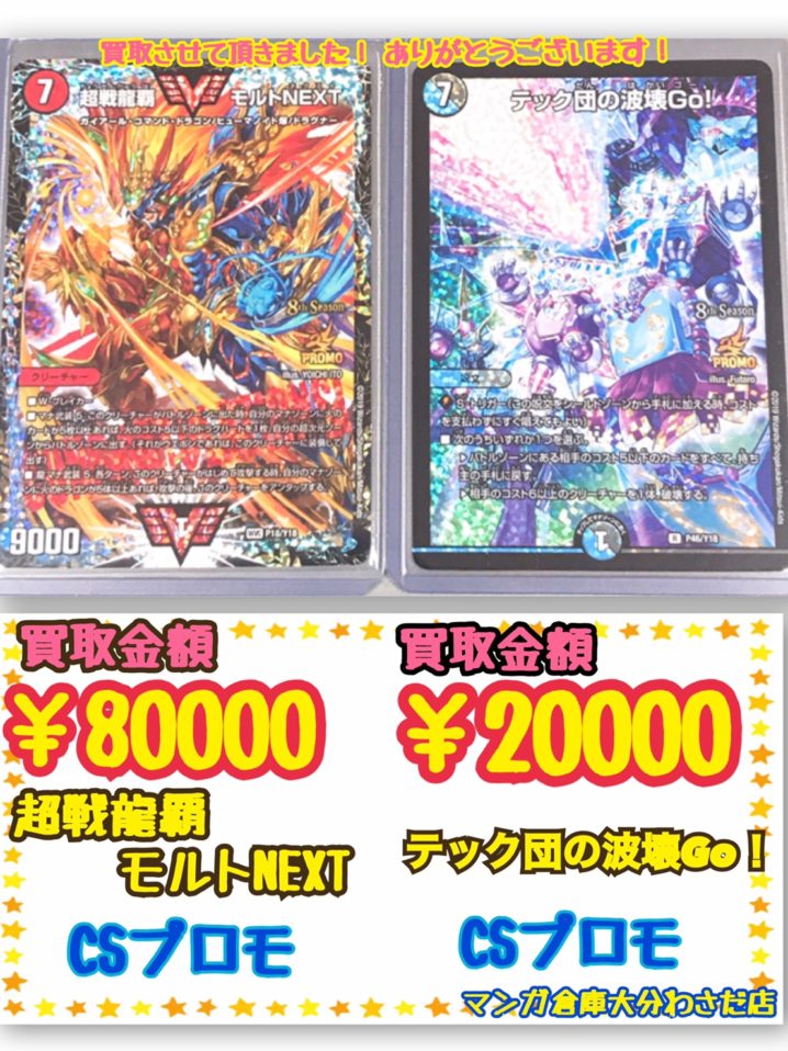 デュエルマスターズプレイヤーの皆様! 素晴らしいカードを買取させて頂きましたよ( -`ω-)✧ テック団の波壊Go! P46/Y18 CSプロモ! 超戦龍覇モルトNEXT P18/Y18 CSプロモ! それも2枚も…