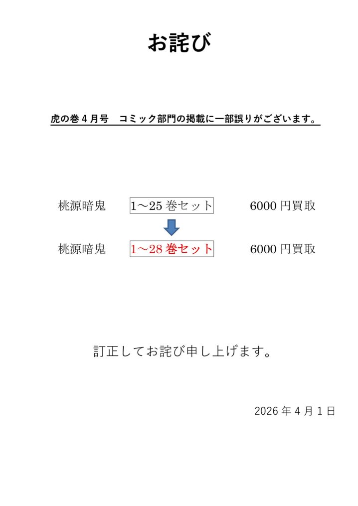 お宝買取虎の巻4月号ができました!°˖✧◝(⁰▿⁰)◜✧˖° WEBチラシにも一緒に掲載しておりますので、そちらもご覧ください! 2026年4月1日現在の価格なので、 最新の価格はWEBチラシバナーをタップしてご確認くだ…