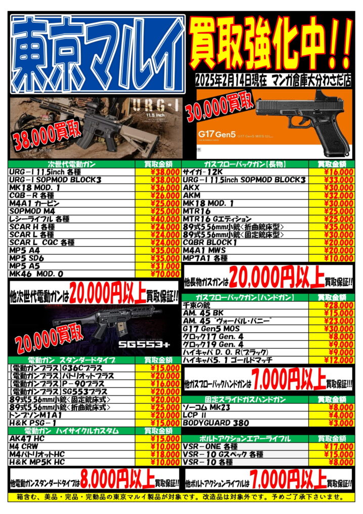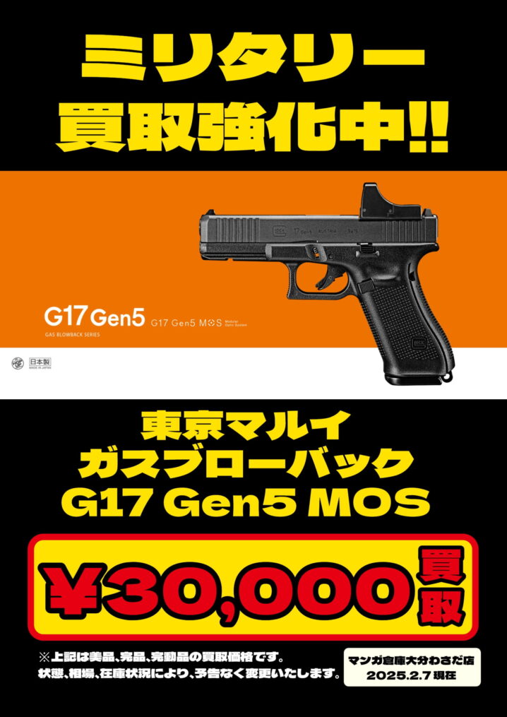 マンガ倉庫大分わさだ店ではエアガン買取強化中です!! ※2025/2/14現在の価格となります。 ※箱含む、美品・完品・完動品の東京マルイ製品が対象です。カスタム品は対象外となります。予めご了承下さいませ。 エアガンだけ…
