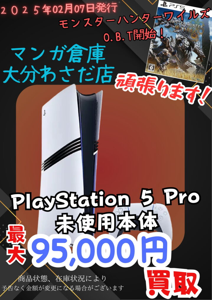 モンスターハンターワイルズのオープンベータテストが2月7日から2月10日、2月14日から2月17日に開催されます! それにあわせてマンガ倉庫大分わさだ店はPS5各種本体の買取を強化しています! これを機に買い替えの検討を…