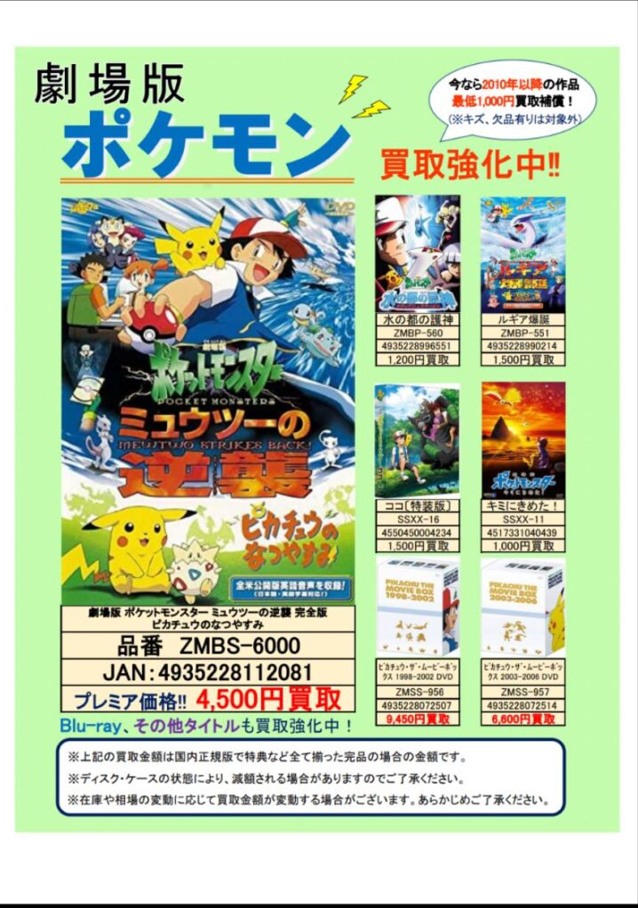 ★買取情報★ 早いものでもうすぐ今年も夏休みシーズンが来ます! 夏といえばそう!ポケモン映画のシーズンです!!(*´∀`*) 今月号の虎の巻でも、 2010年以降の劇場版ポケモンDVD・blu-rayを最低1,000円買…