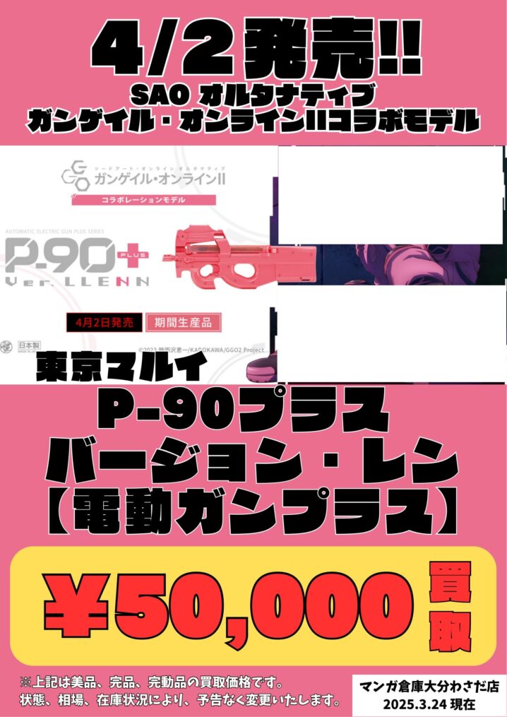 エアガンの買取告知です! 4月2日発売の東京マルイ P-90プラス バージョン・レン 50,000円で買取いたします! 箱含む、美品かつ完品・完動品が対象となります。カスタム品は対象外です。 ※在庫状況により予告なく終了…