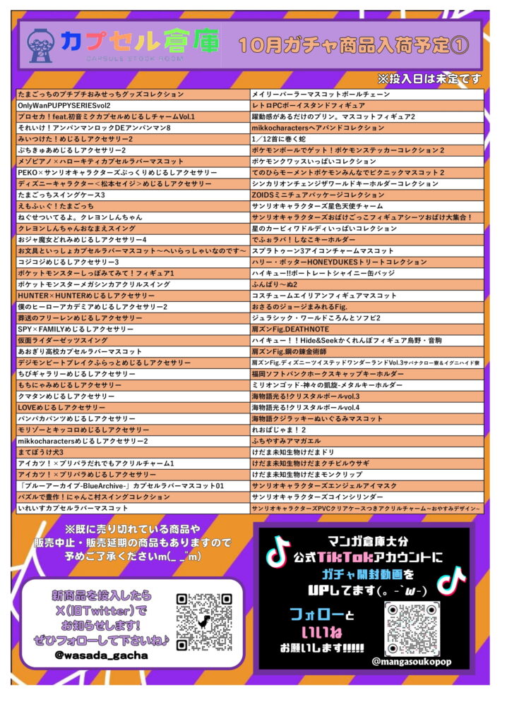 お世話になっております。 投稿のほどお願いします。 10月カプセル倉庫予定表🎃👻 お待たせいたしました- ̗̀📦 ̖́- マンガ倉庫大分わさだ店 10月カプセル倉庫予定表作…