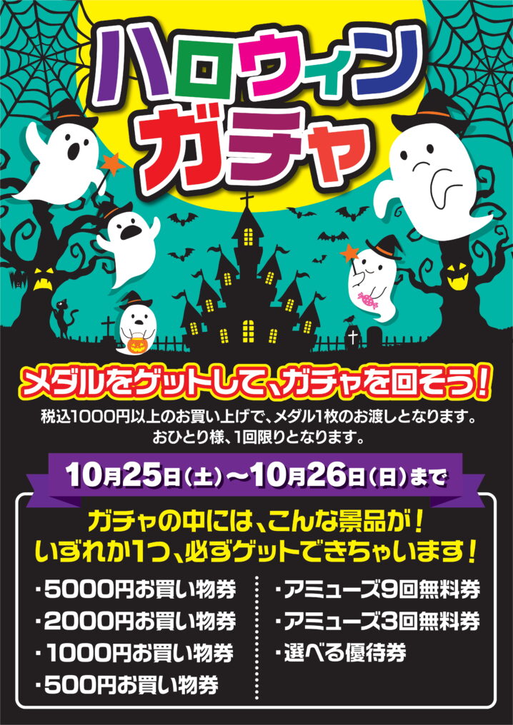 税込1000円以上のお買い物でメダルをゲットしてガチャを回そう! 期間は10月25日〜26日の2日間限定で開催!! ガチャからはお買い物券やアミューズ無料券が出てくるゾ 仮装コンテストもまだまだ開催中!! たくさんの仮…