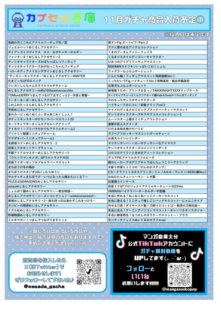 11月カプセル倉庫予定表👾💜 大変お待たせいたしました- 📦 – マンガ倉庫大分わさだ店 11月カプセル倉庫予定表作りました(*≧∀≦*) カプセル倉庫のガチャ…