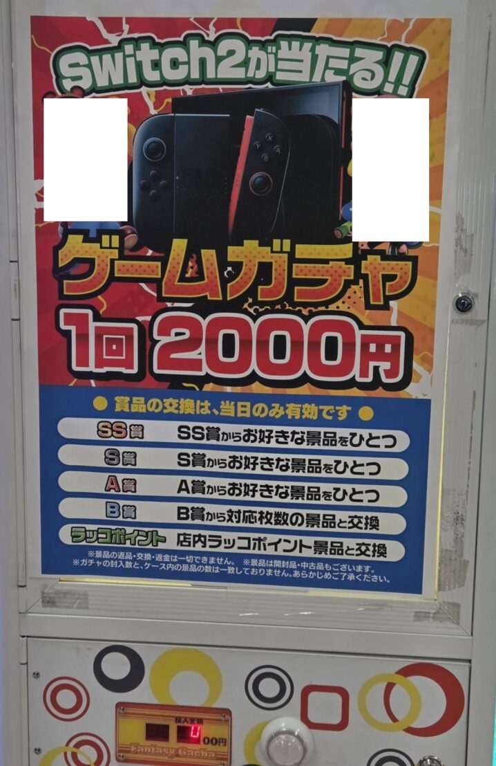 本日からゲーム1000円ガチャを2000円ガチャにリニューアルしました! SS賞にはNintendo Switch2本体を投入させて頂きました✨ 景品が更に豪華になった2000円ガチャに挑戦してみませんか!…