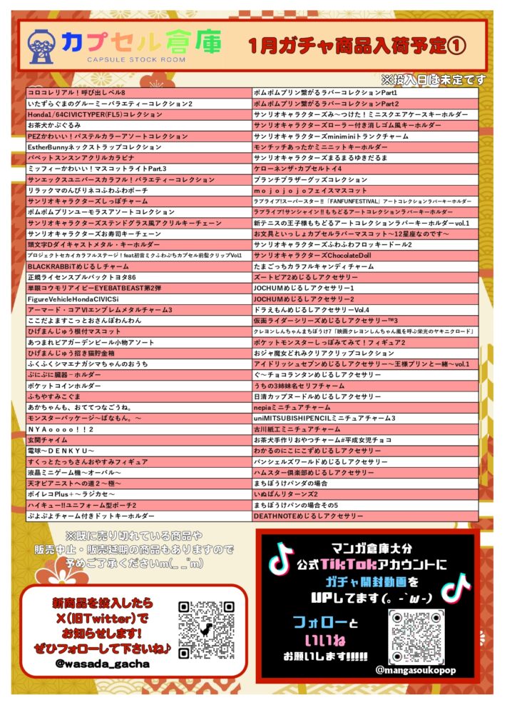 大変お待たせいたしました- ̗̀📦 ̖́- マンガ倉庫大分わさだ店1月カプセル倉庫予定表ですっ!!(*≧∀≦*) カプセル倉庫のガチャの投入日は未定ですので、店舗にお問い合わせいただいてもお答えできません…