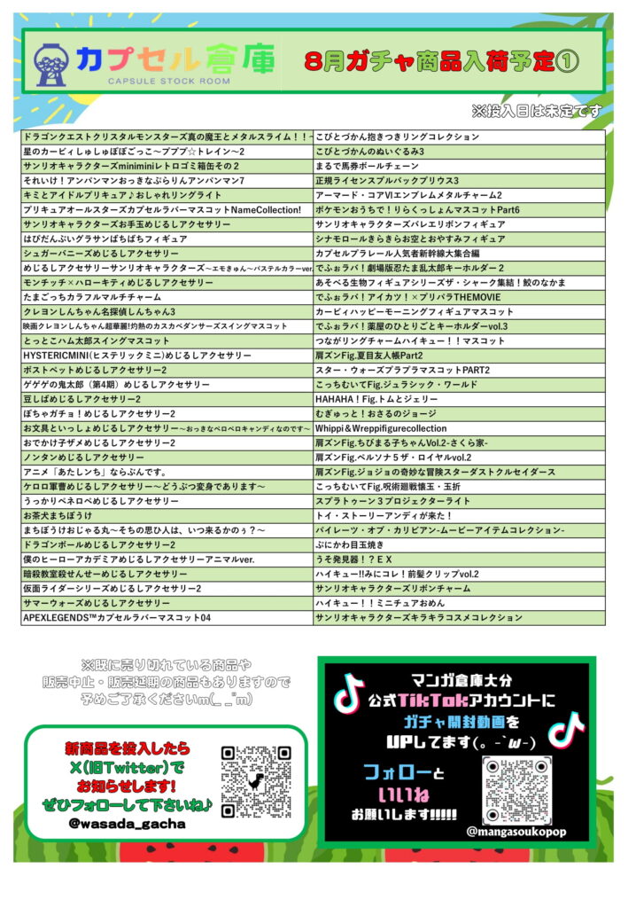 8月カプセル倉庫予定表🎆 お待たせいたしました- 📦 – マンガ倉庫大分わさだ店 8月カプセル倉庫予定表作りました-⁽ -´꒳`⁾- カプセル倉庫のガチャの投入日は未定ですので…