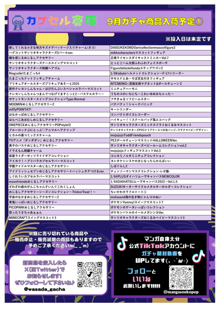 9月カプセル倉庫予定表🎑 お待たせいたしました- ̗̀📦 ̖́- マンガ倉庫大分わさだ店 9月カプセル倉庫予定表作りました-⁽ -´꒳`⁾- カプセル倉庫のガチャの投入日は未定ですので、店…